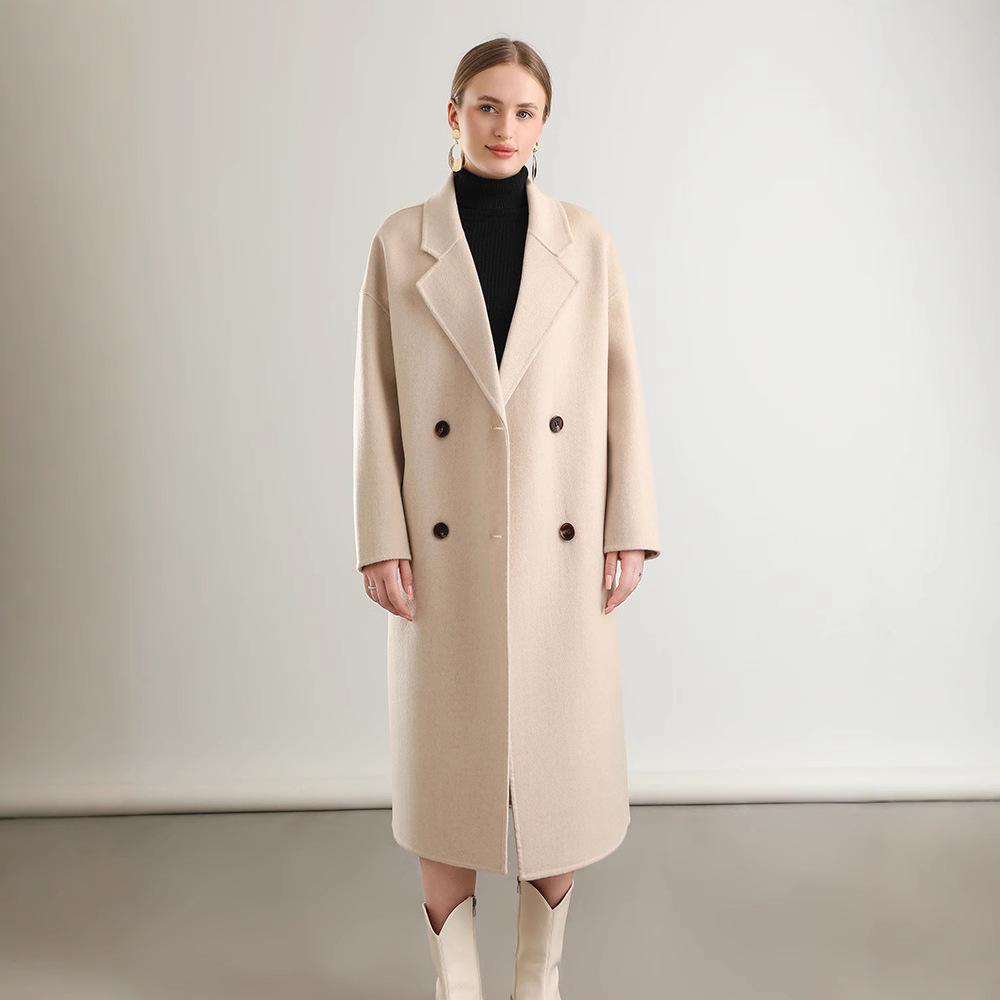 Женское шерстяное двубортное пальто средней длины свободного кроя на осень 2024
