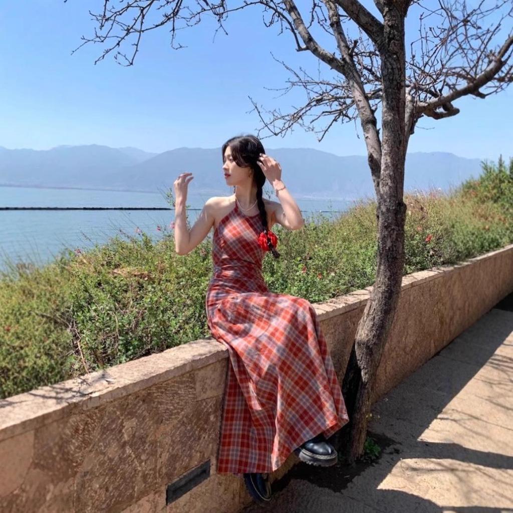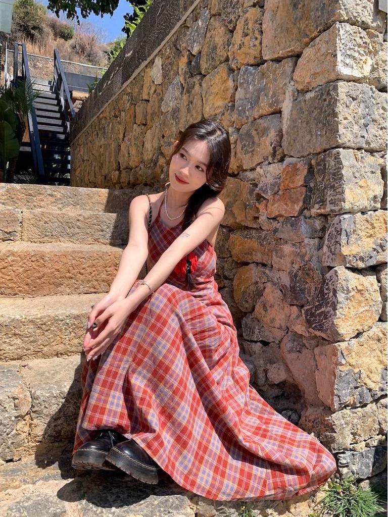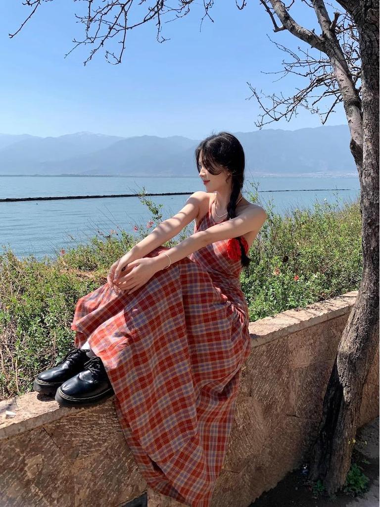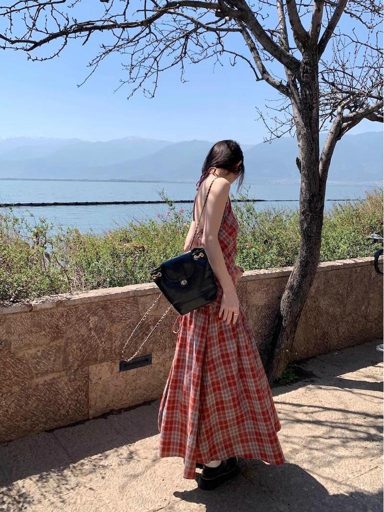 Летнее платье в клетку гингем без спинки на бретелях-спагетти