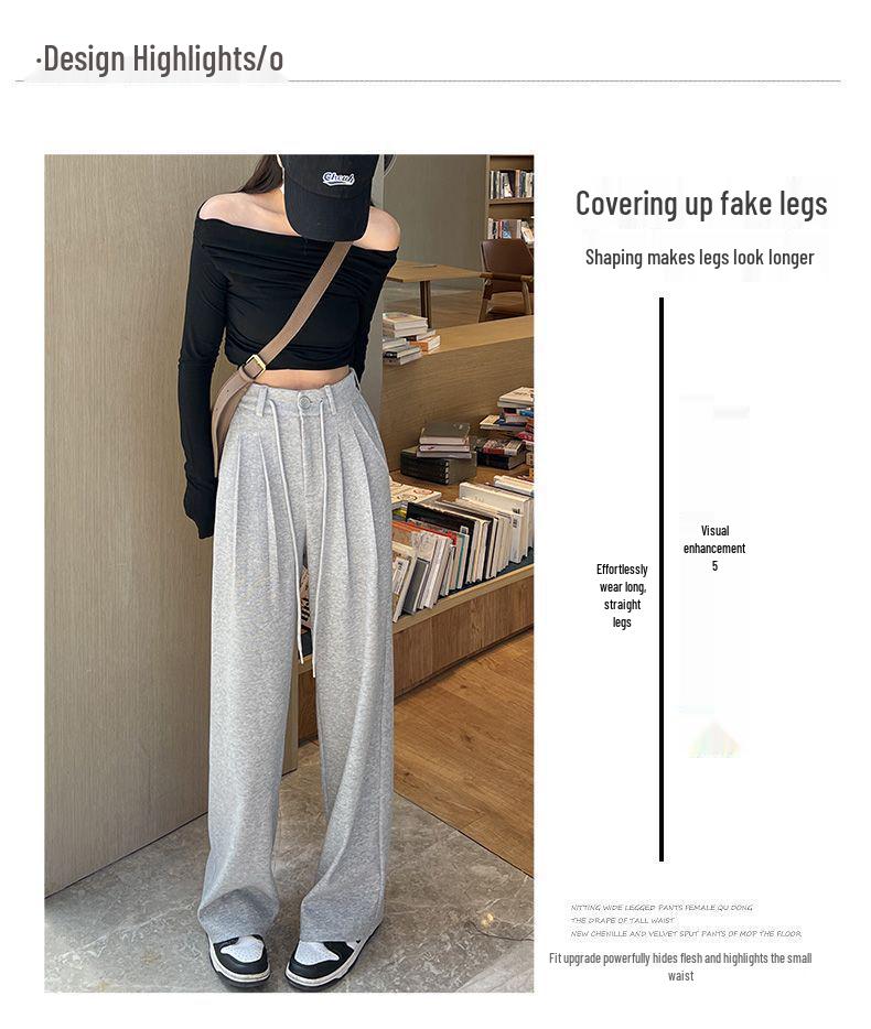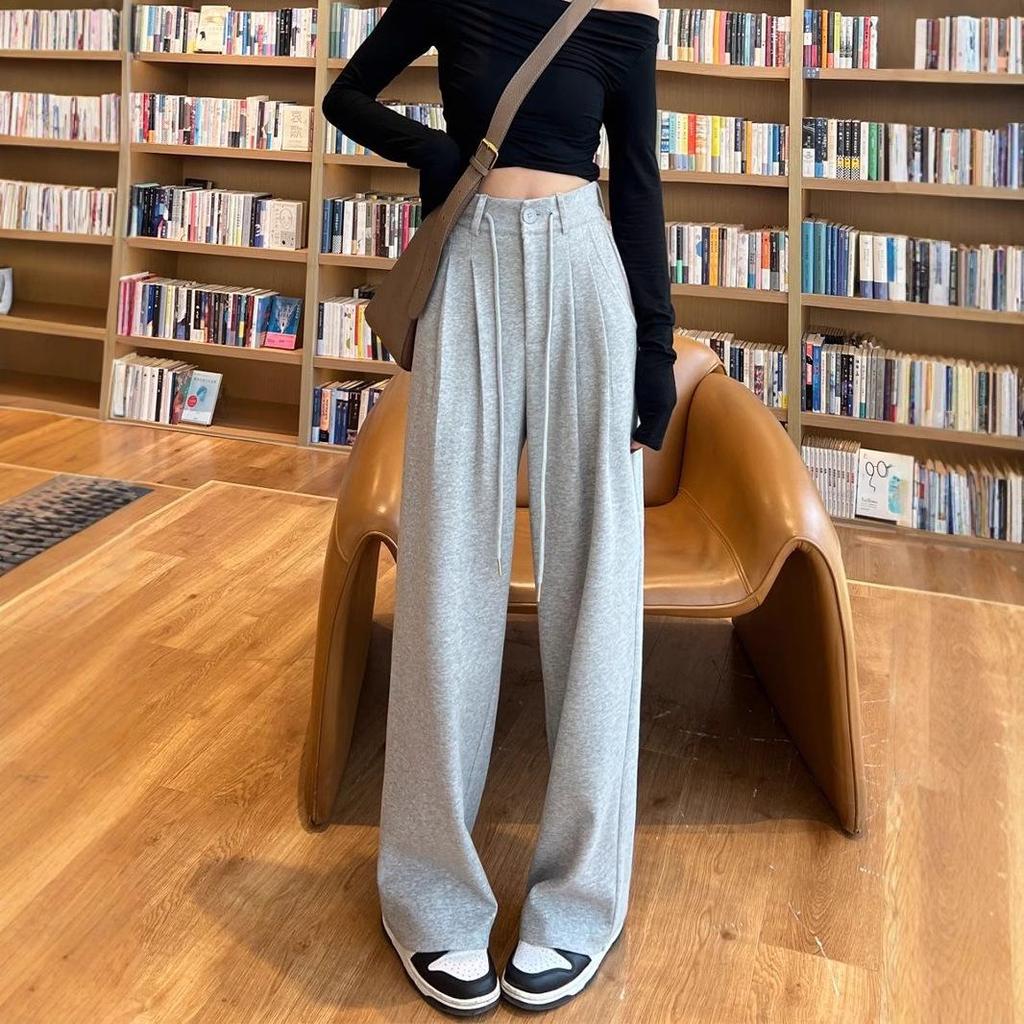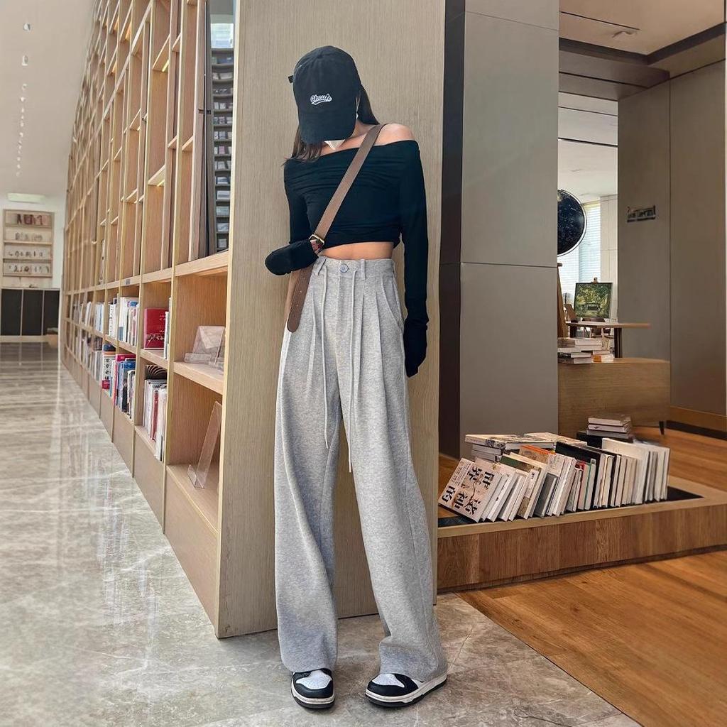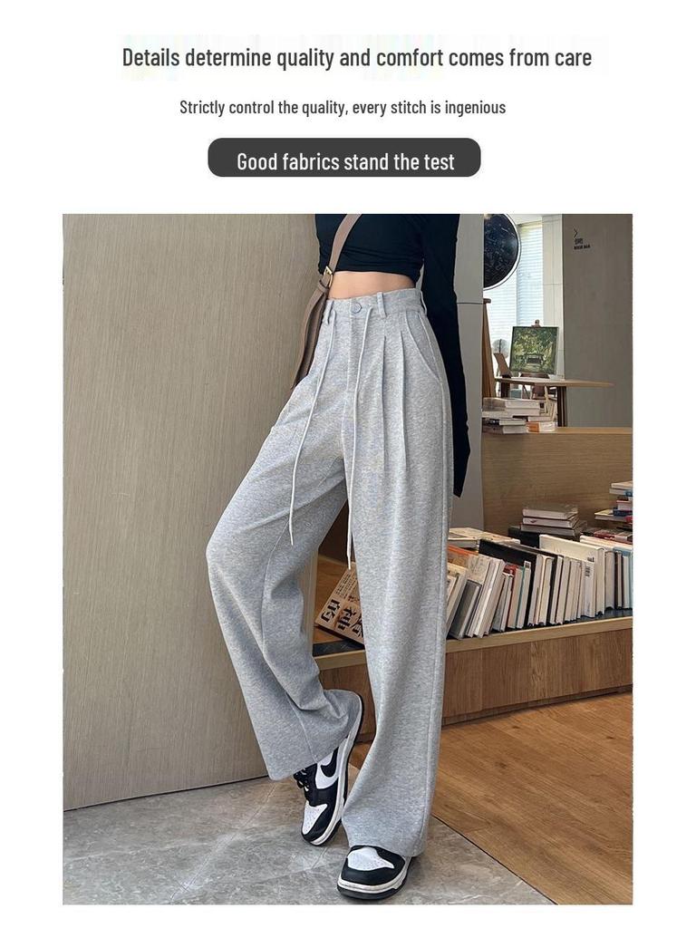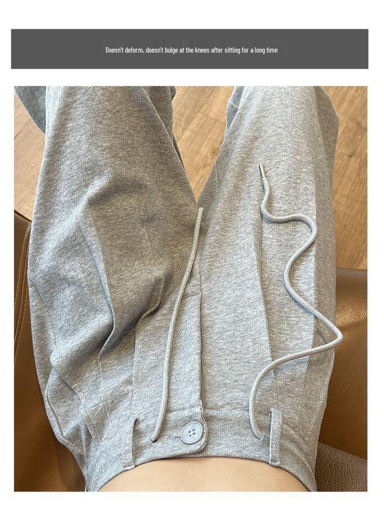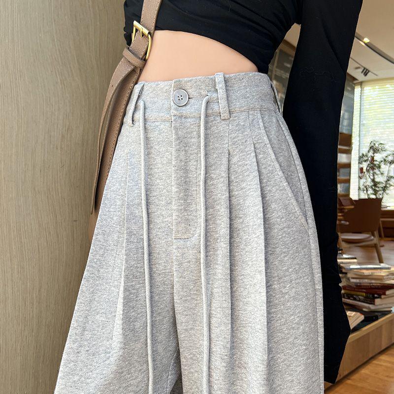 Серые женские спортивные брюки с высокой посадкой и широкими штанинами - Весенне-осенние повседневные свободного кроя со шнурком