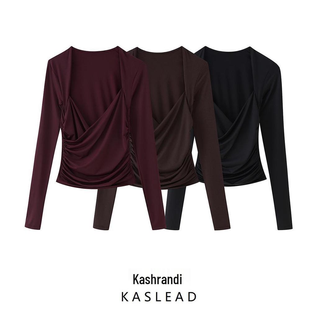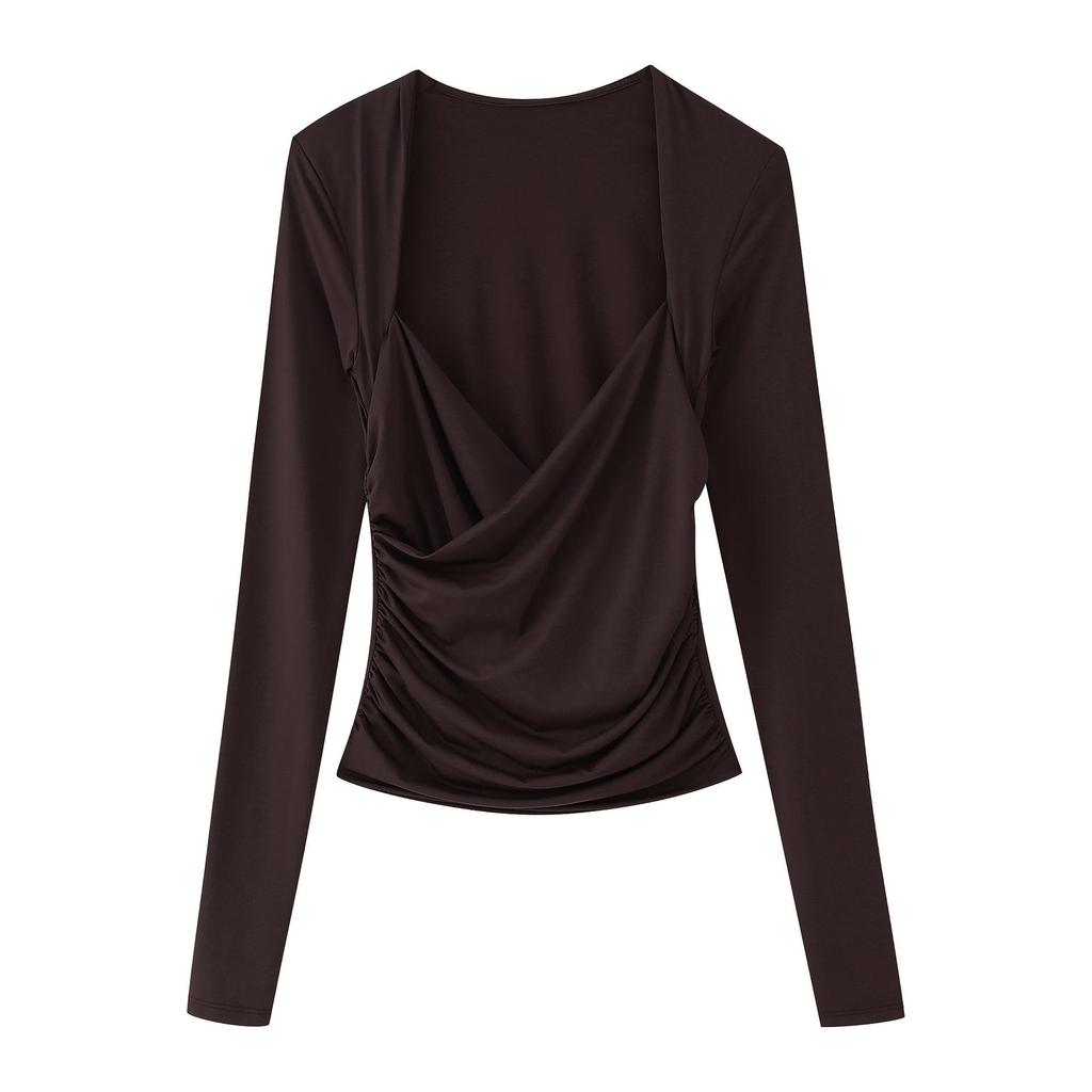 Весна 2025 Женский Европейский и Американский Стиль Топ из Нейлона с Драпированным Вырезом и Плиссированными Длинными Рукавами