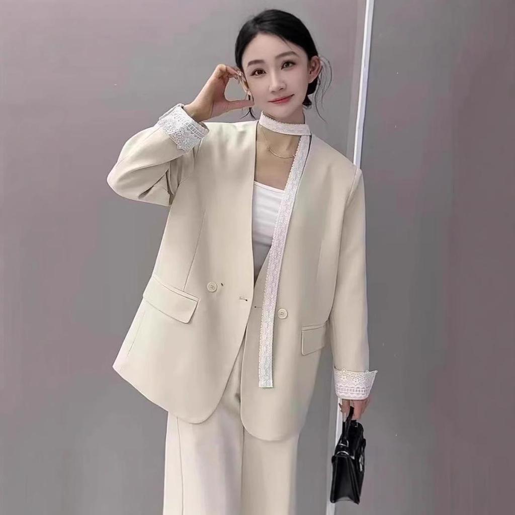 Женский пиджак-костюм с V-образным вырезом и кружевной отделкой - Весна 2025, Высококлассный европейский стиль, Повседневный топ