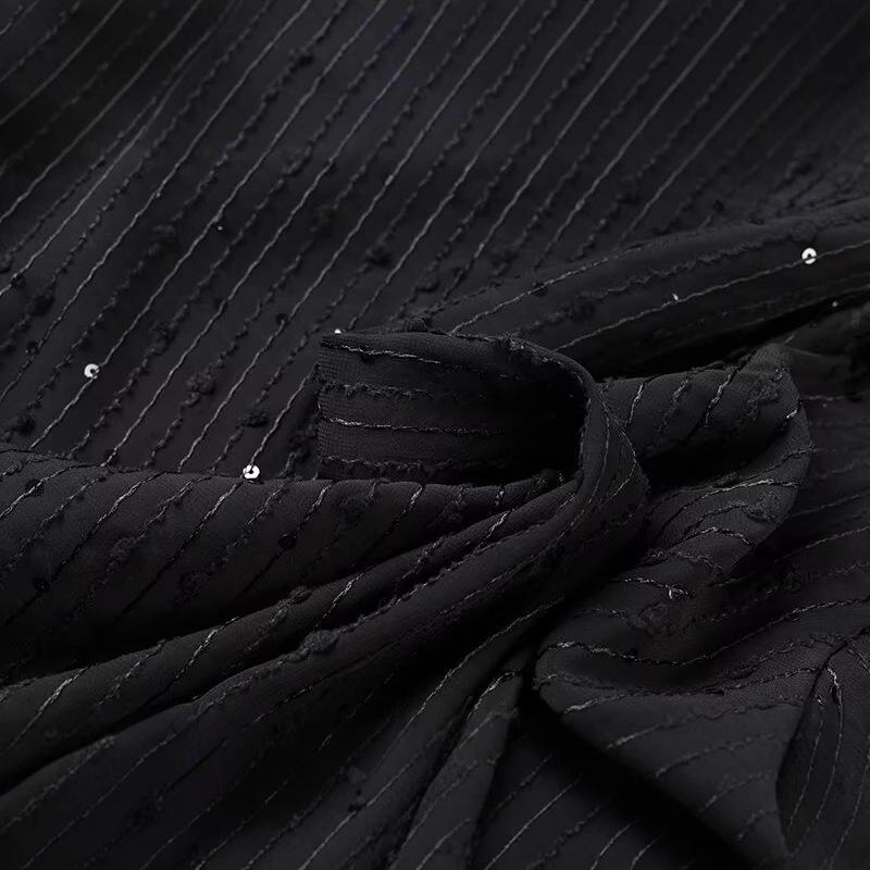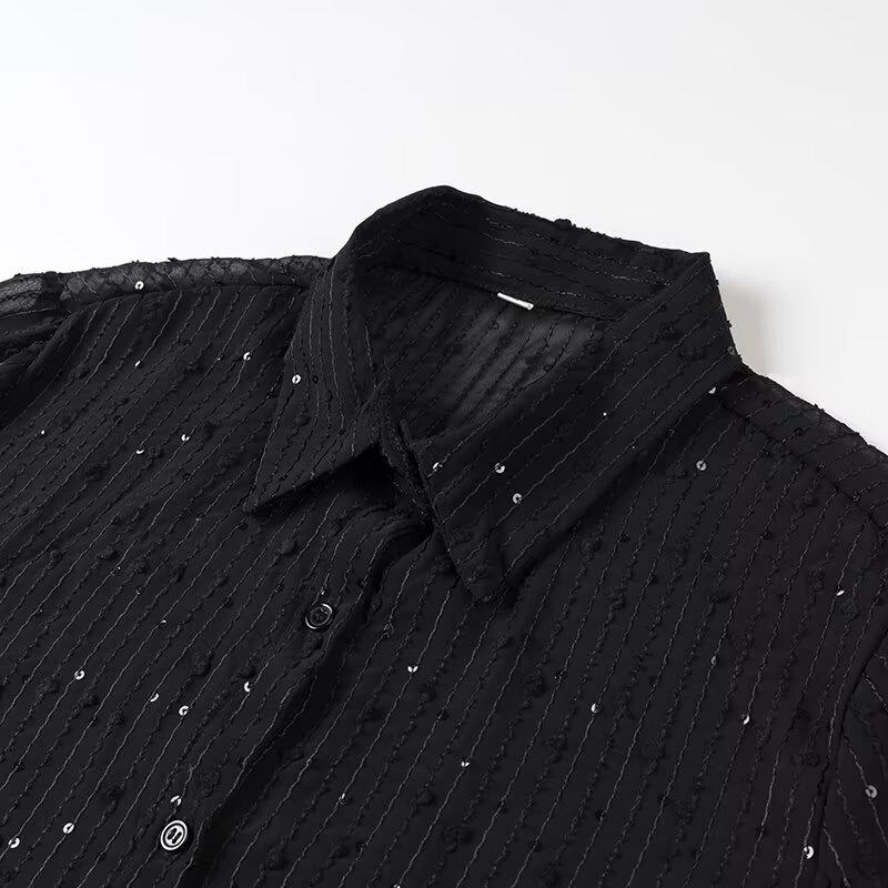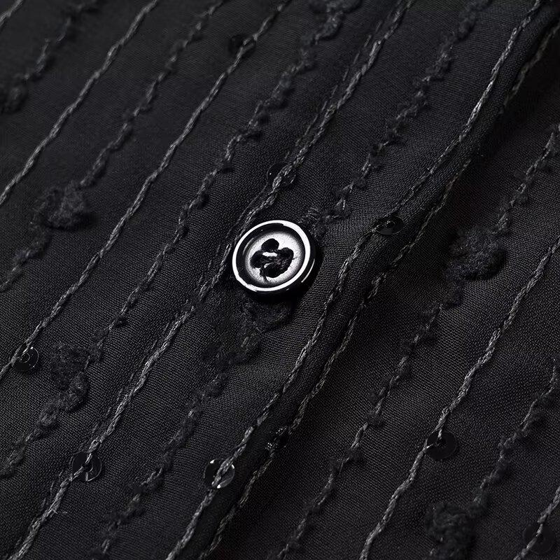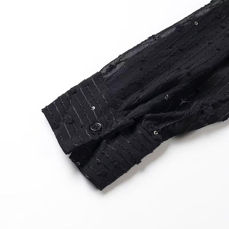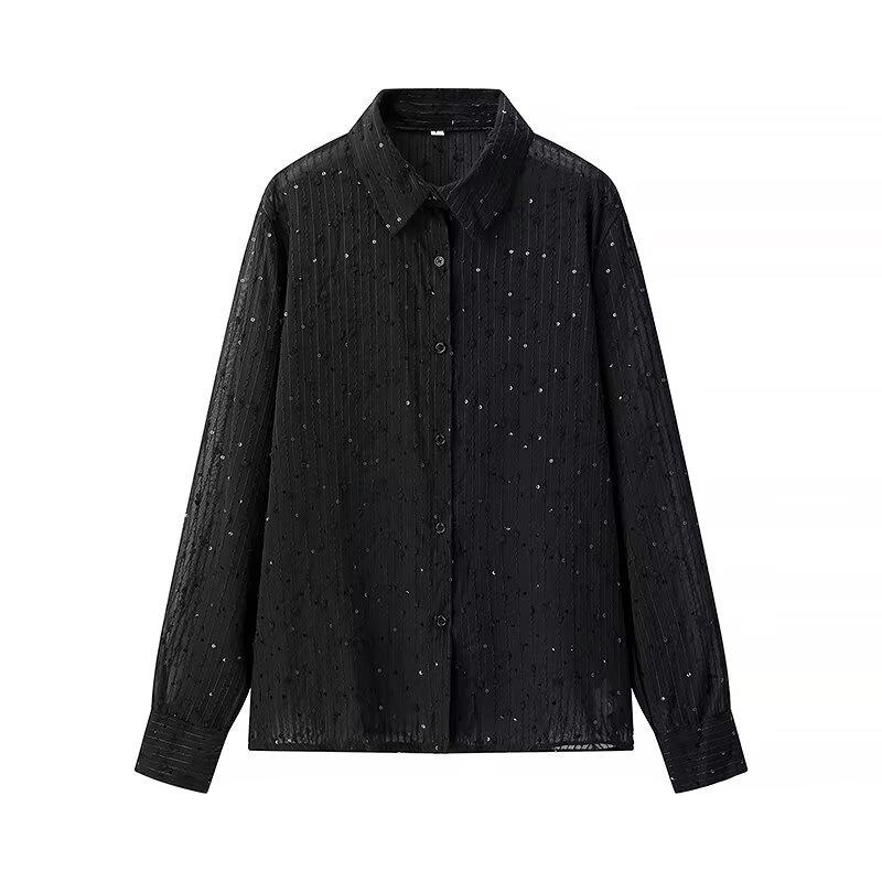 Представляем шикарную вещь для вашего гардероба, эту рубашку с длинным рукавом, воплощающую суть женской моды Весны 2025 года слиянием европейских и американских стилистических влияний.. Изготовлен из высококачественного полиэстера, обеспечивает комфорт и долговечность.. Благодаря модному дизайну с вырезами и пайетками, он идеально подходит для добавления блеска вашему наряду.. Свободный крой и приталенный вырез горловины создают изысканный, но непринужденный силуэт, что делает его идеальным выбором для универсального стайлинга.. Собираетесь ли вы на вечерний выход или ищете выдающуюся вещь для повседневной носки, эта рубашка привносит элегантность и современный шик.