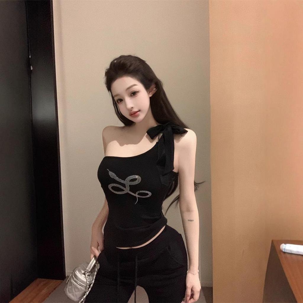 Шикарный черный топ-майка на одно плечо со стразами - Женская летняя майка без рукавов — купить товар онлайн с бесплатной доставкой до всему миру!