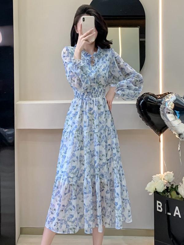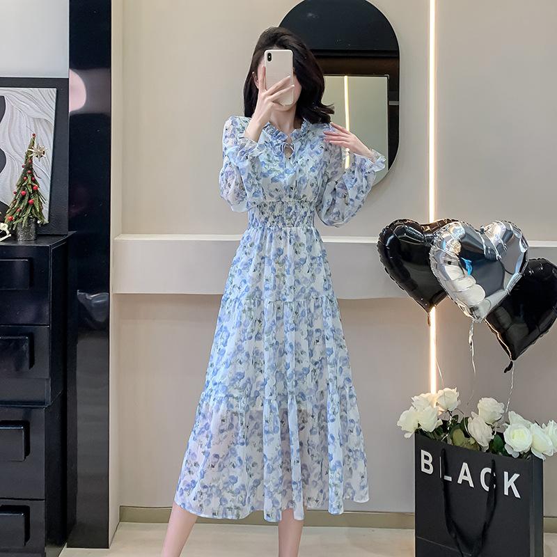 Корейское платье с оборками и розами: Элегантное длинное платье, стройнящее талию, с французскими милыми оборками по краям.