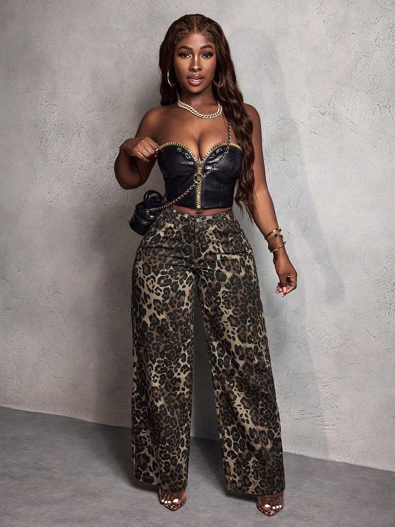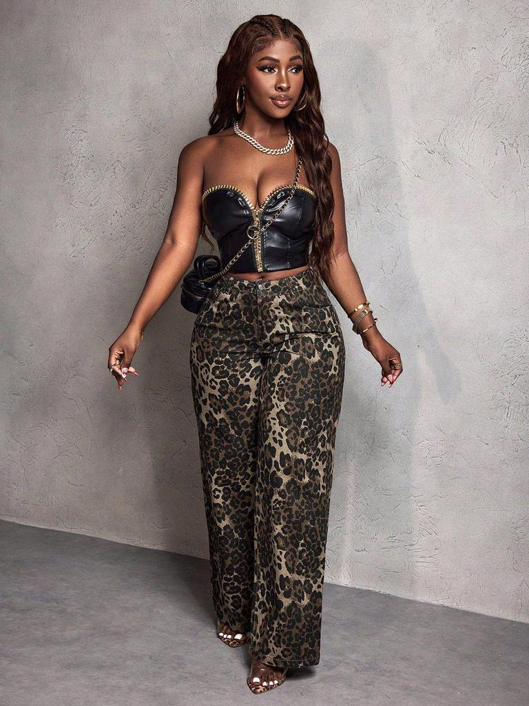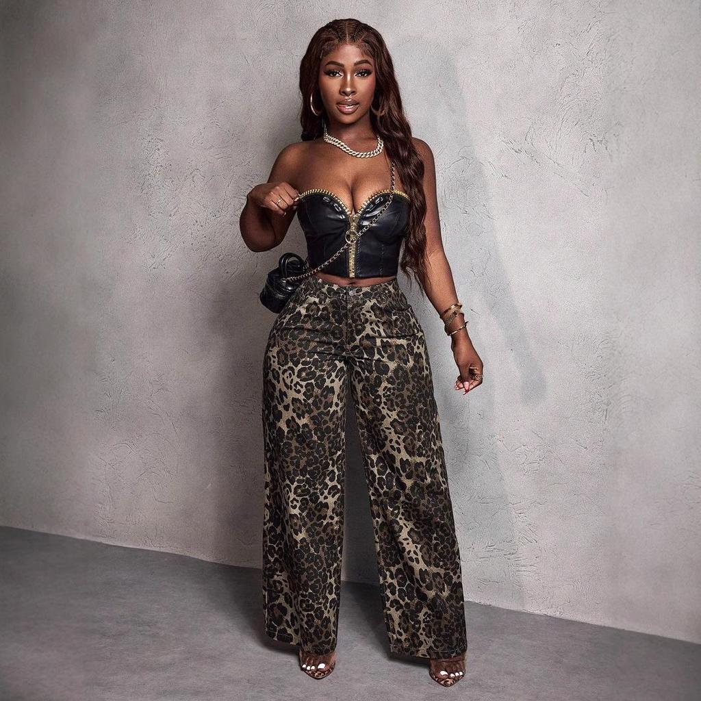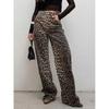Женские джинсовые брюки с леопардовым принтом, с высокой талией и широкими штанинами - Новый европейский и американский стиль