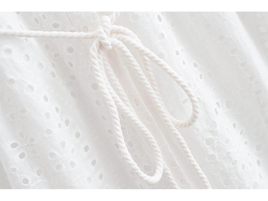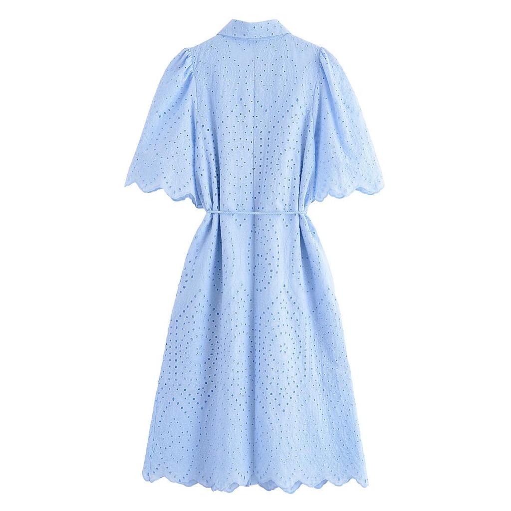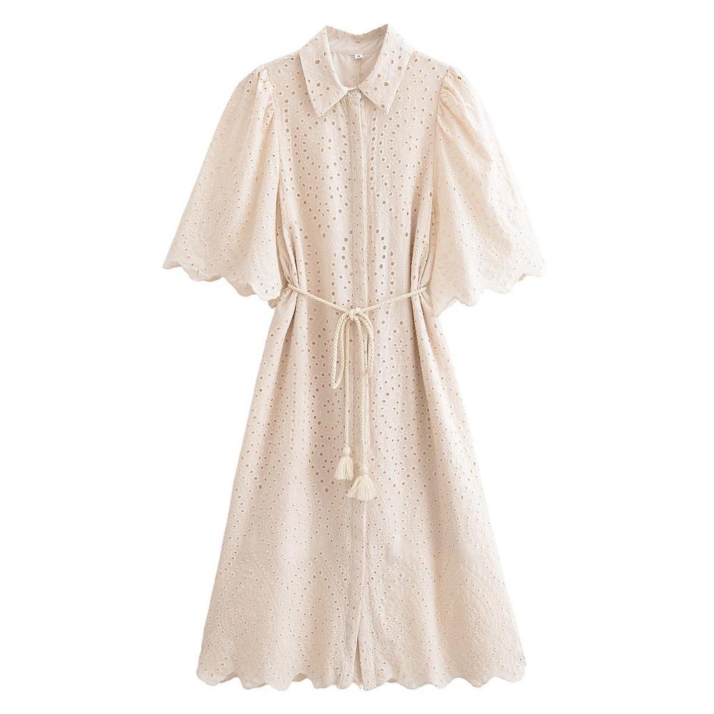 2025 Spring Women's European & American Style Loose Lapel Belt Floral Hollow-Out Dress