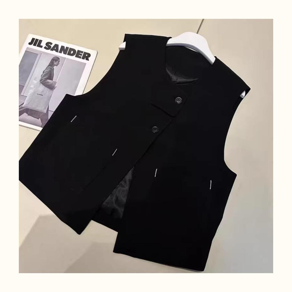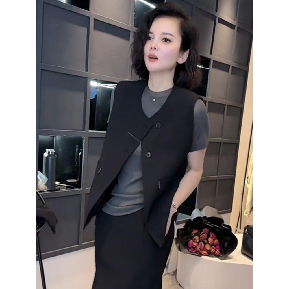 Женская приталенная черная блузка с круглым вырезом и пуговицами - Стильная мода Весна 2025 с уникальным дизайном жилета