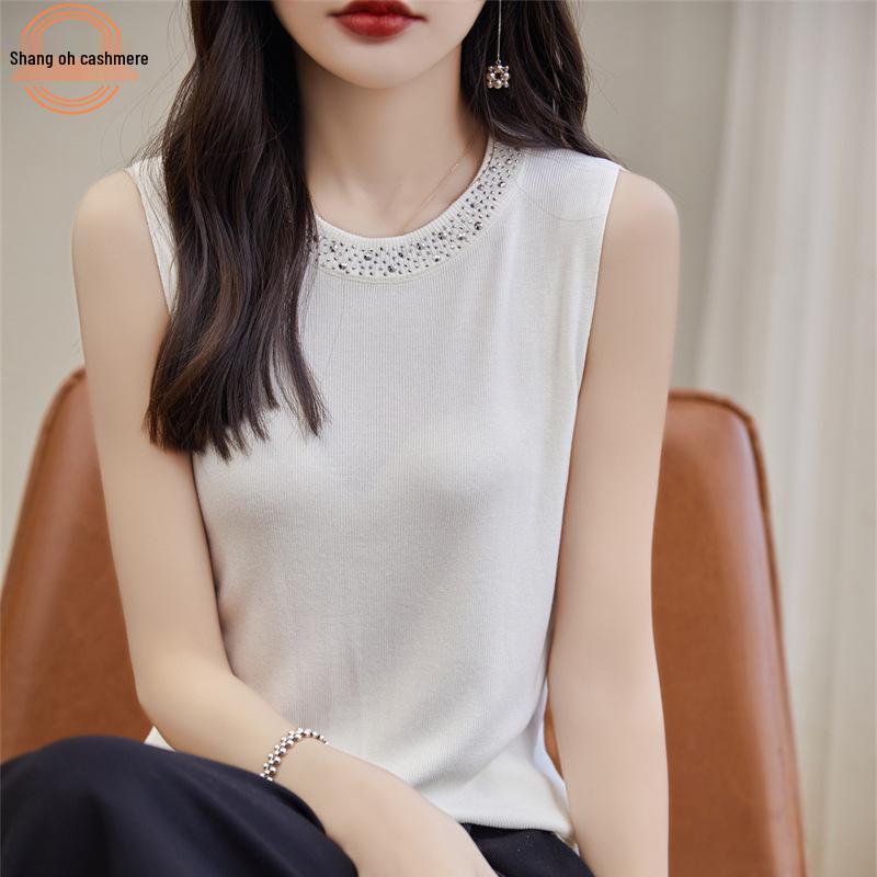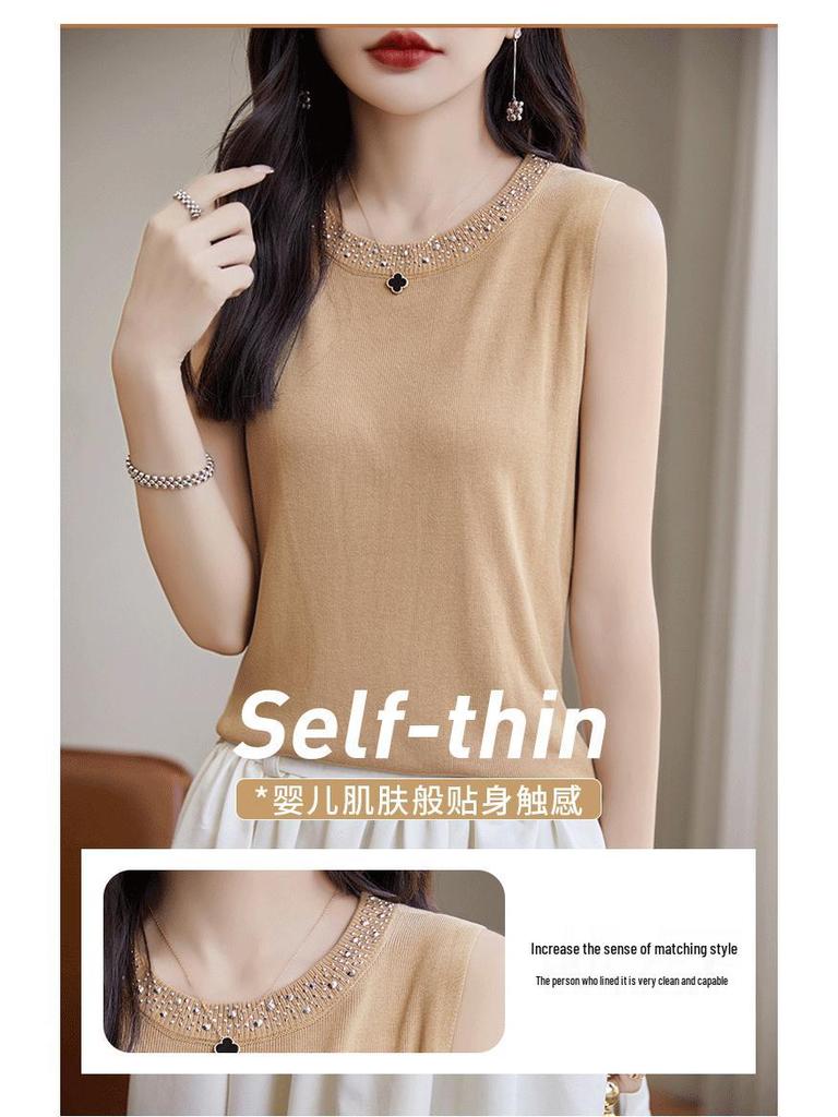 Модный трикотажный топ без рукавов из ледяного шелка: Женская модная майка с круглым вырезом и горячей отделкой стразами