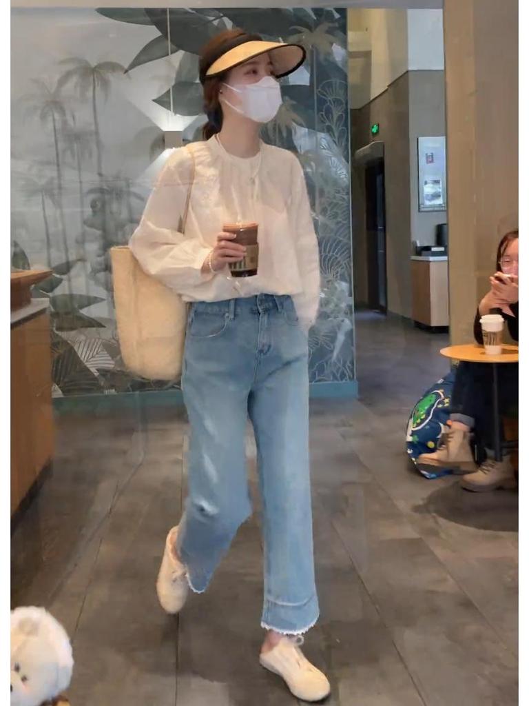 Блузка с длинным рукавом из хлопка в корейском стиле с вышивкой - Женская повседневная жаккардовая рубашка для весны/лета