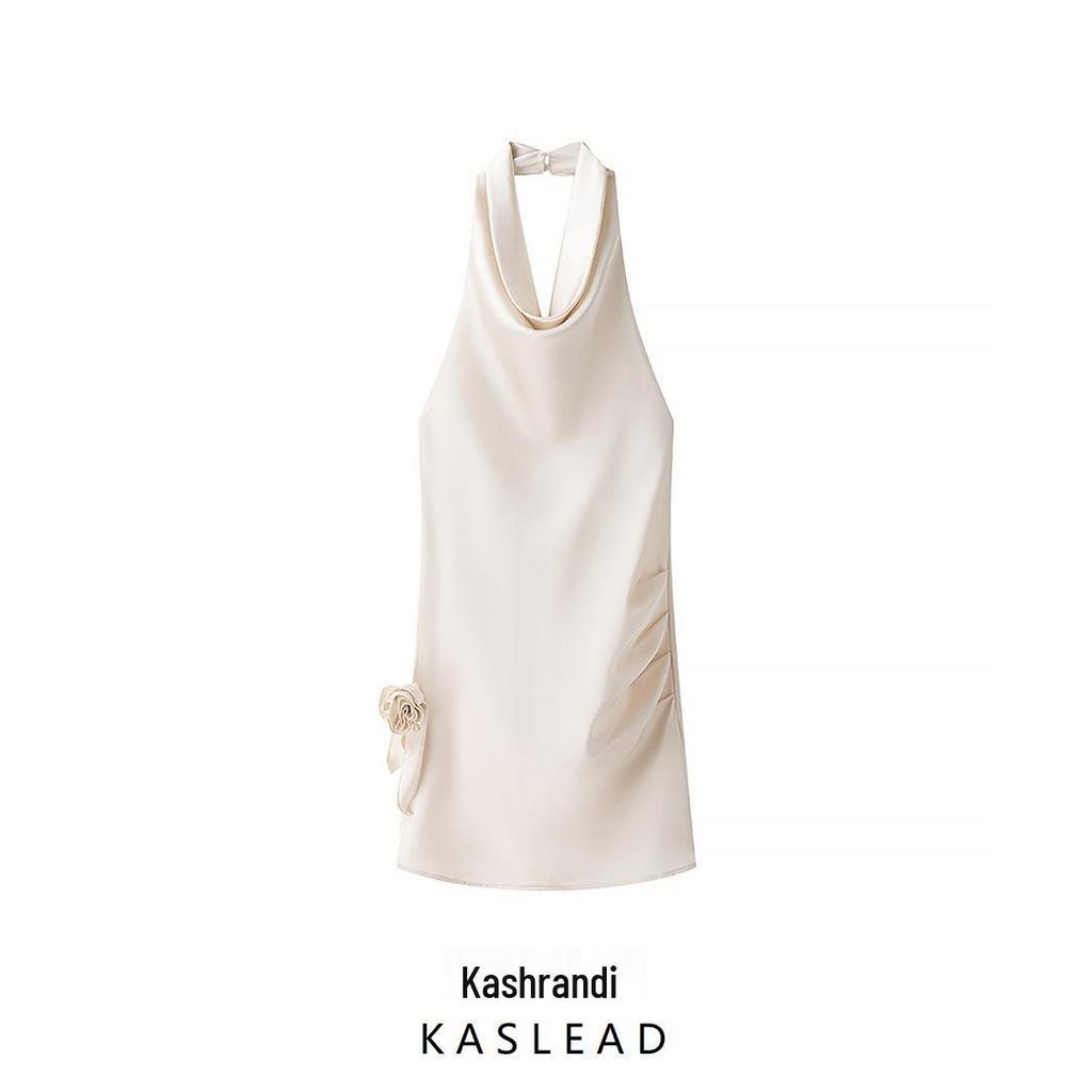 Женская мода весна 2025: Европейский и американский стиль Однотонное мини-платье халтер без спины с цветочными акцентами