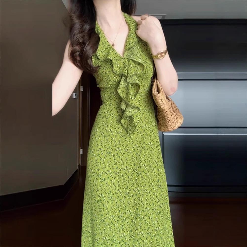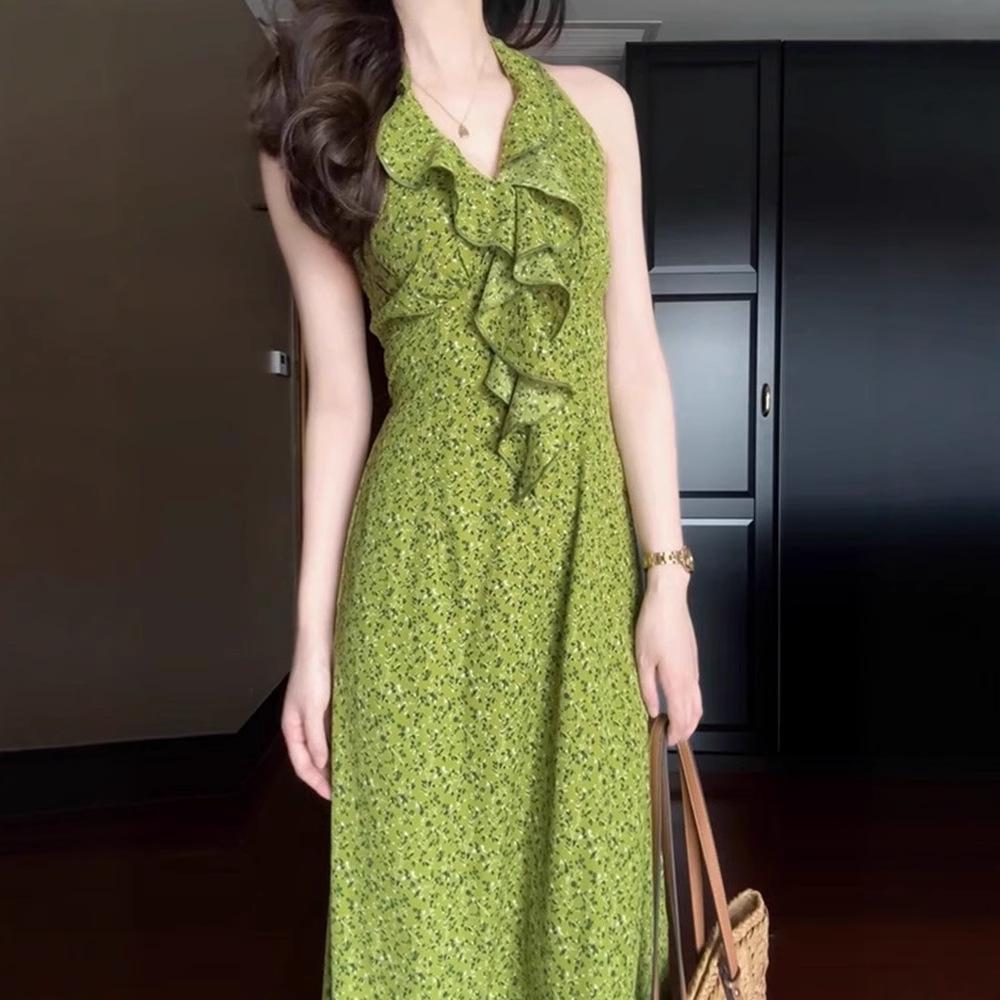 Женское зеленое цветочное платье халтер с V-образным вырезом, без рукавов, длинное - Коллекция Лето 2025