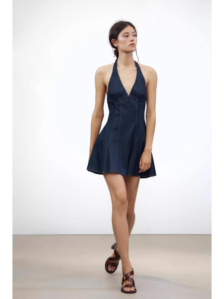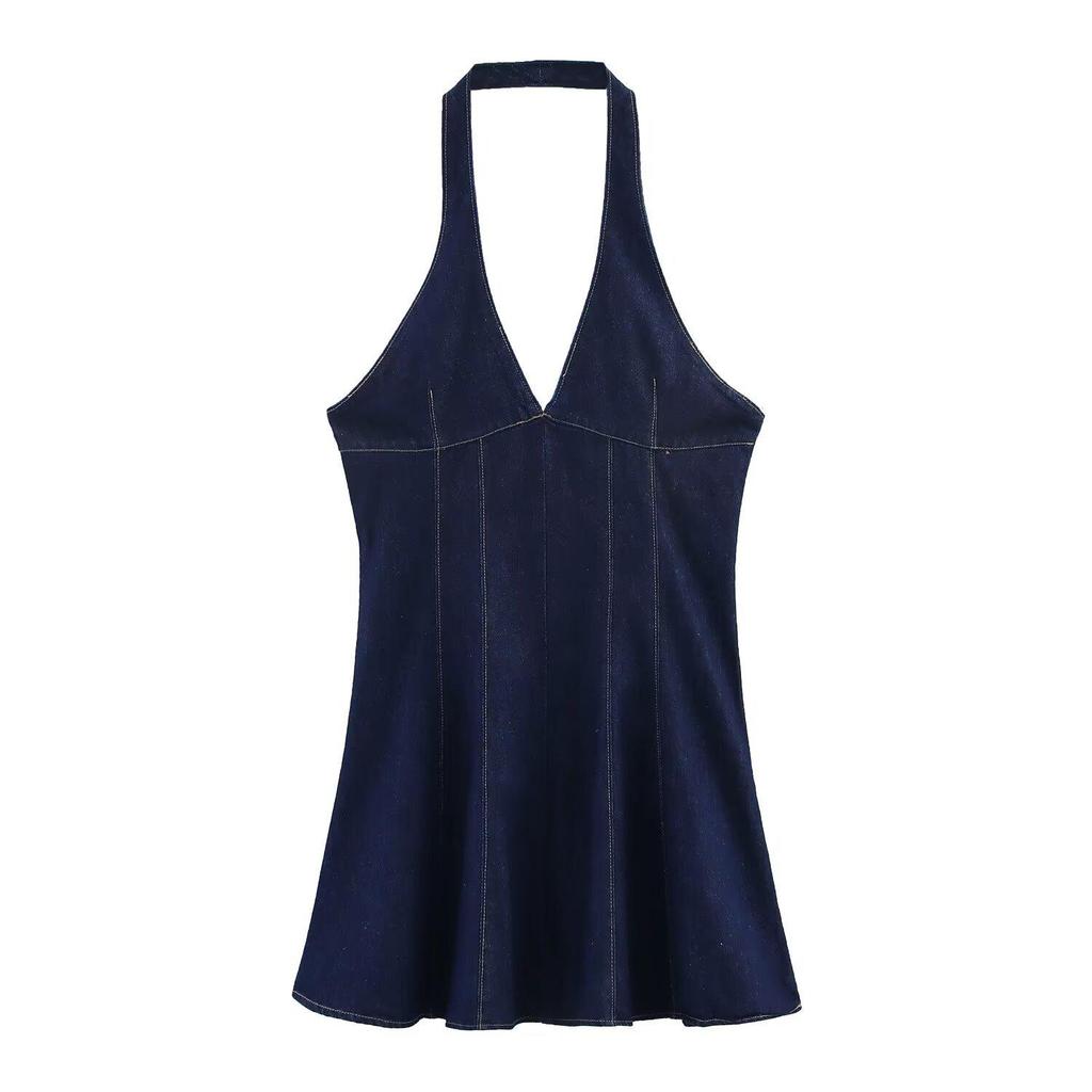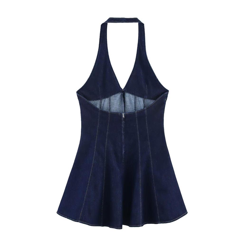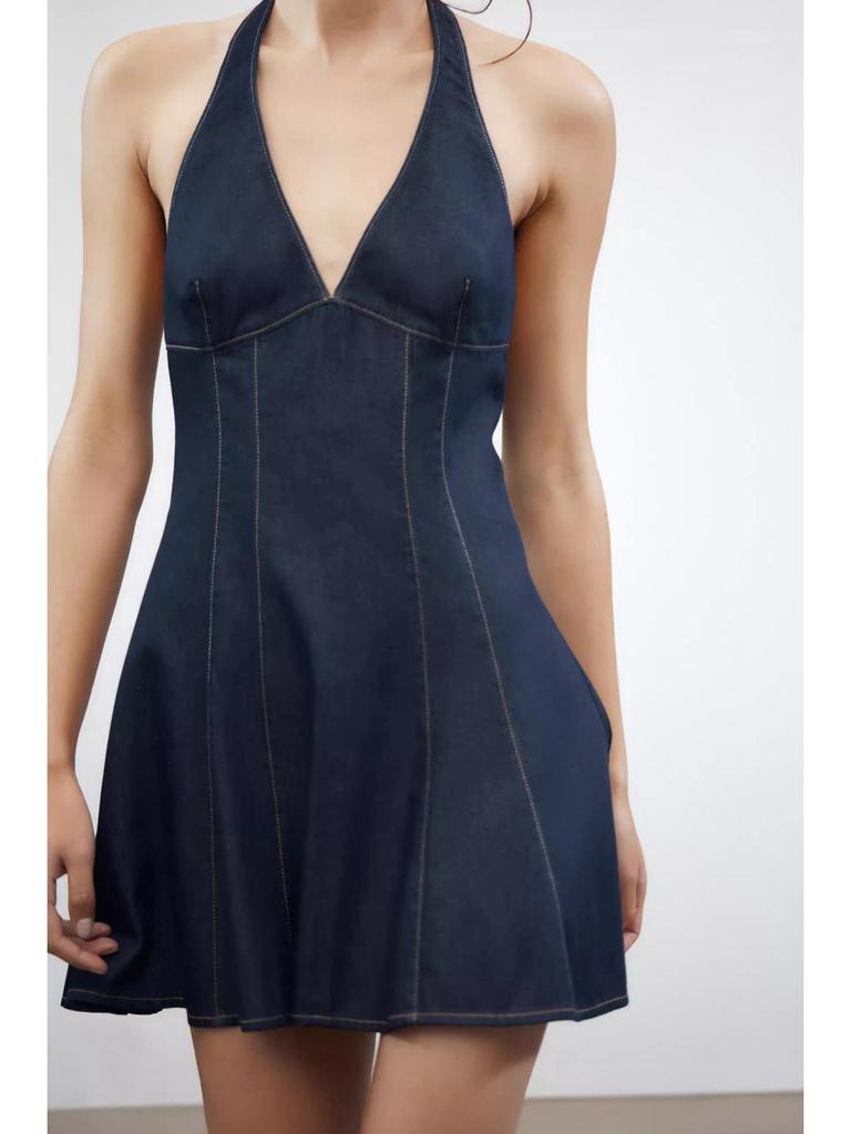 Европейский и американский стиль Сексуальное джинсовое платье-холтер с глубоким V-вырезом - Облегающее платье с короткой юбкой для женщин