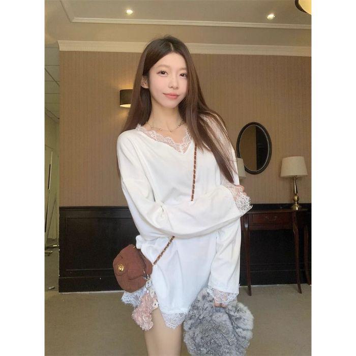 Осень/Зима Корейский Свободный Пуловер С V-образным Вырезом и Кружевными Вставками — купить товар онлайн с бесплатной доставкой по всему миру!