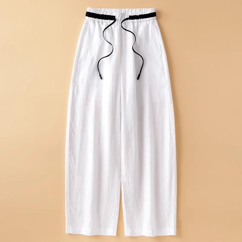Белые хлопково-льняные брюки с высокой посадкой и широкими штанинами для женщин - Летняя мода 2025, Повседневные, Длина девять десятых