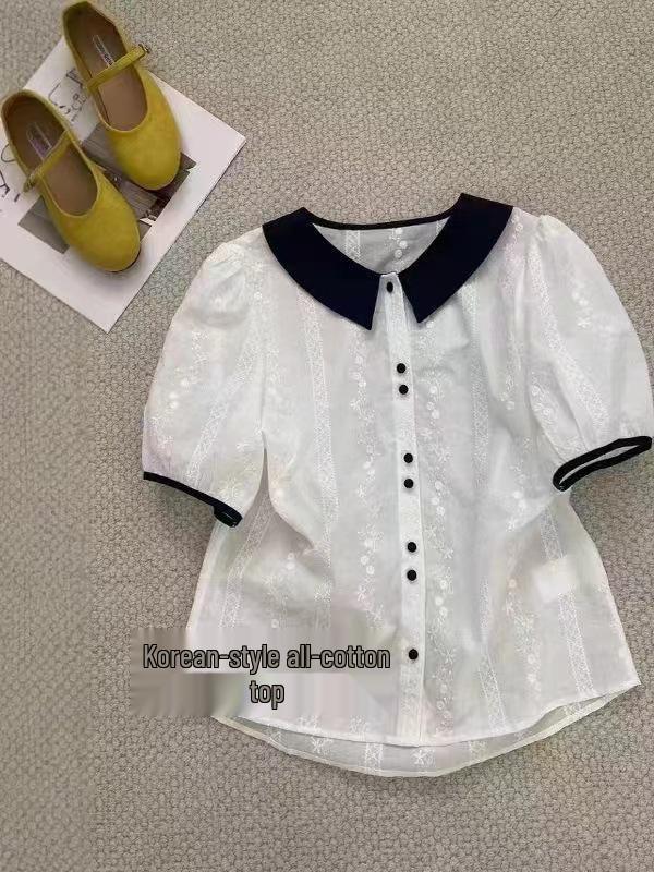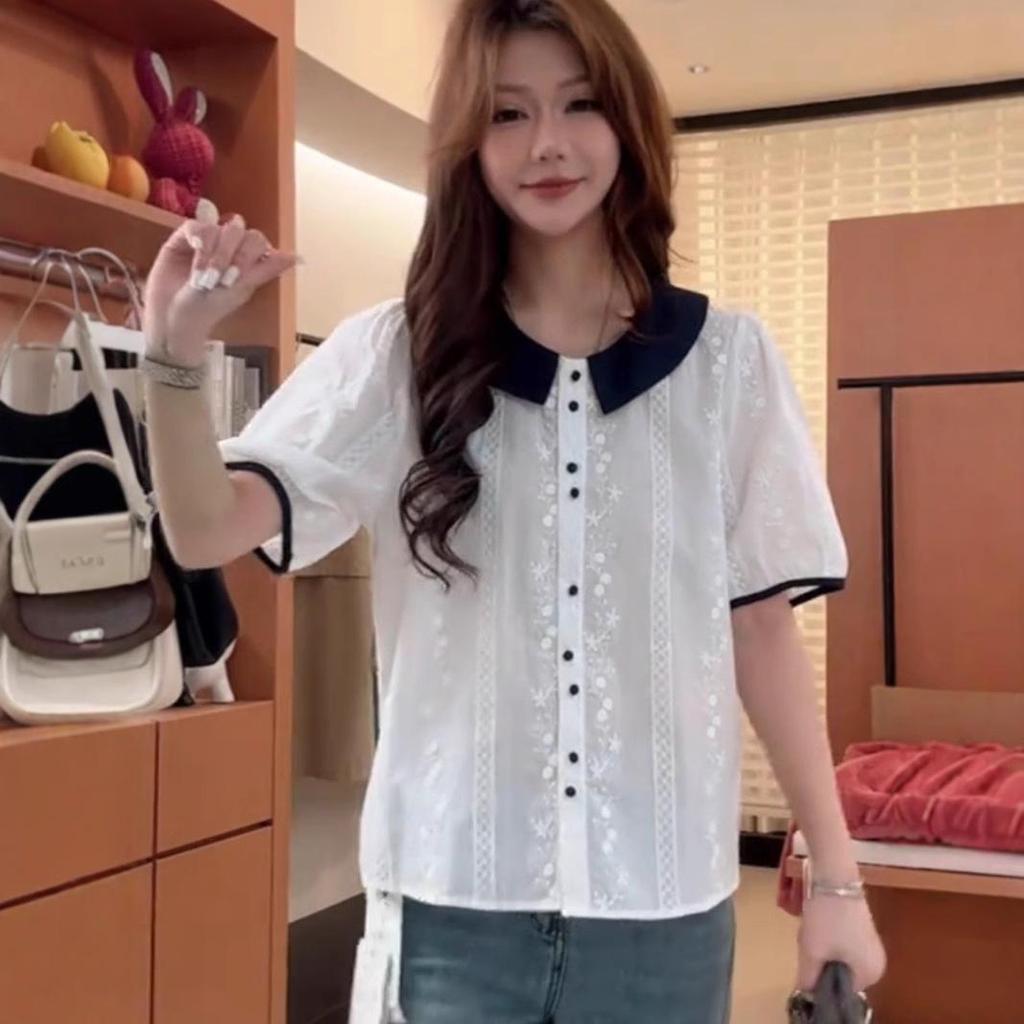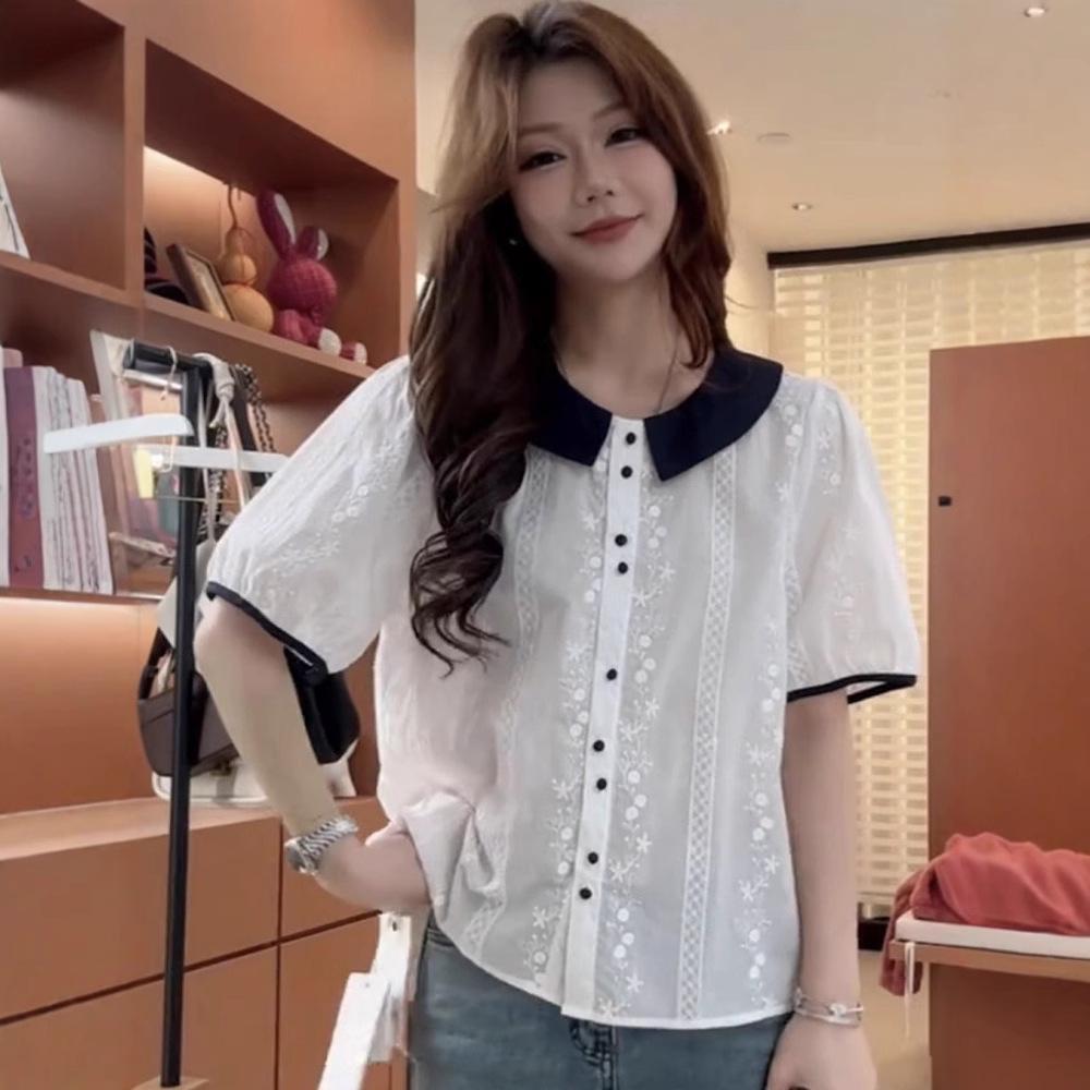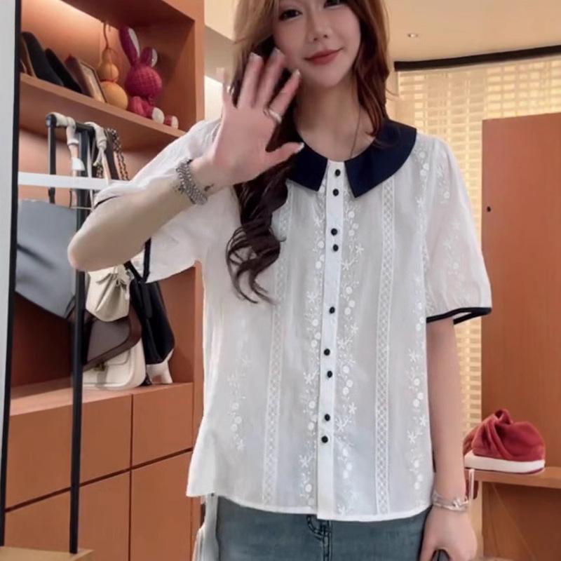 Европейский женский топ с коротким рукавом, свободного кроя, с цветными блоками, кружевной вышивкой и воротником Питер Пэн.