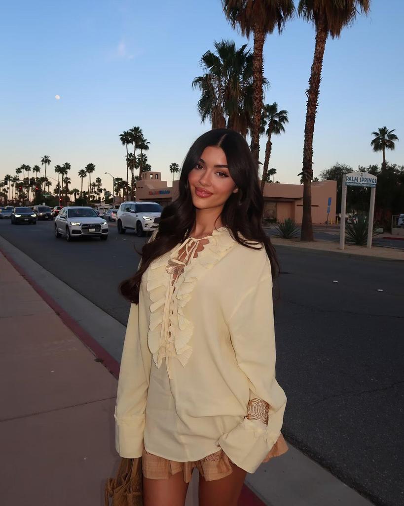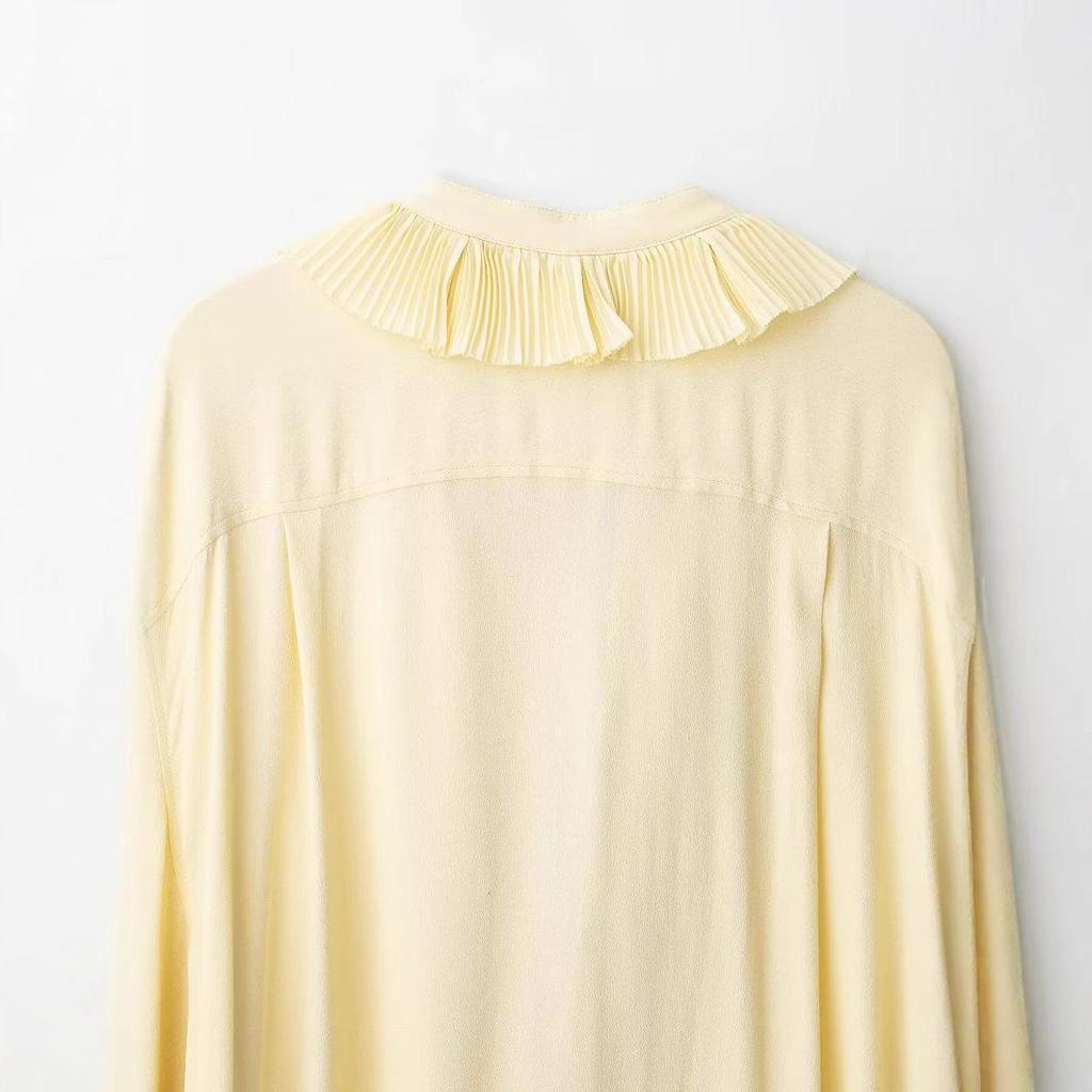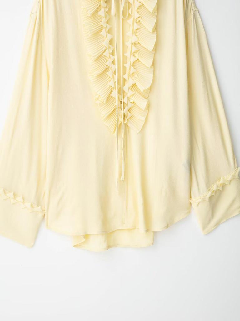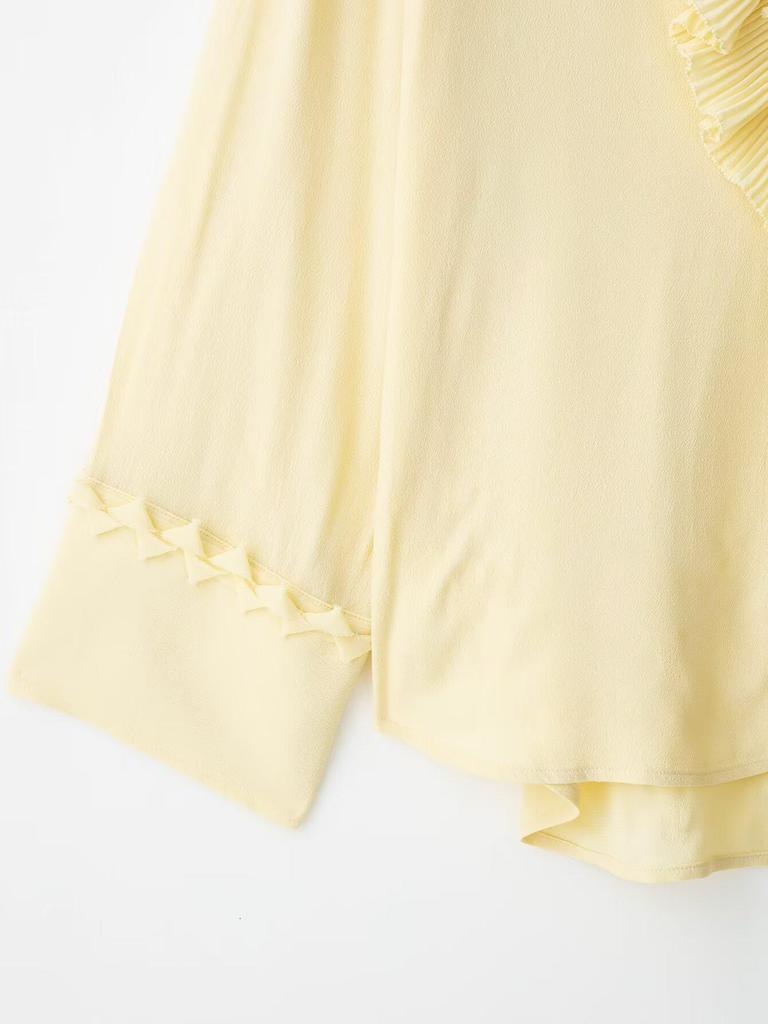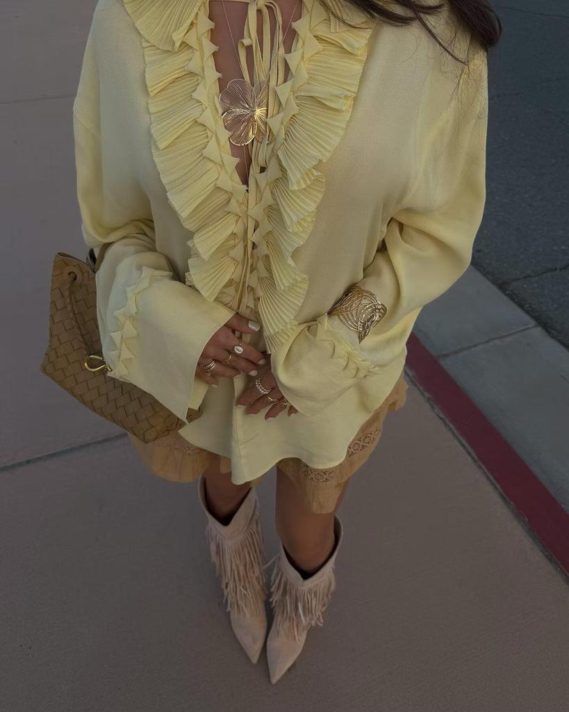 Европейская и американская женская весна 2025 Элегантная светло-желтая блузка с глубоким V-образным вырезом и плиссированным кружевом