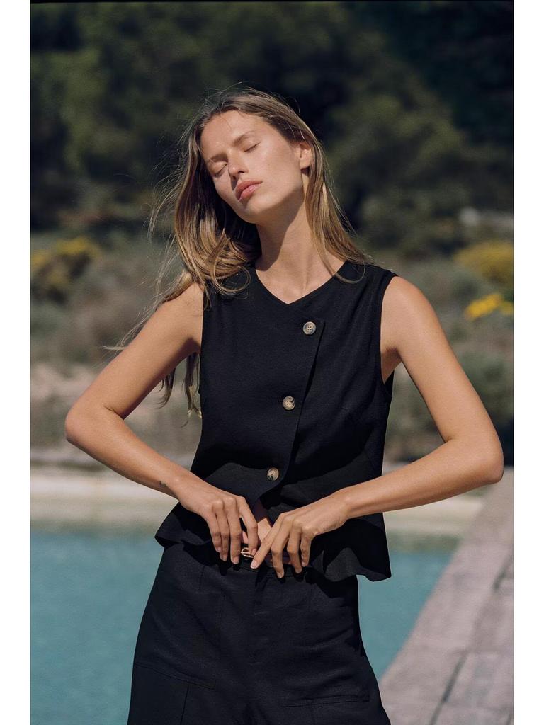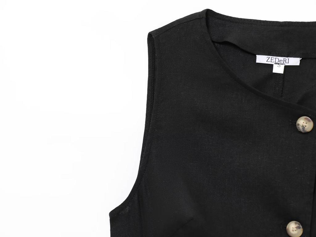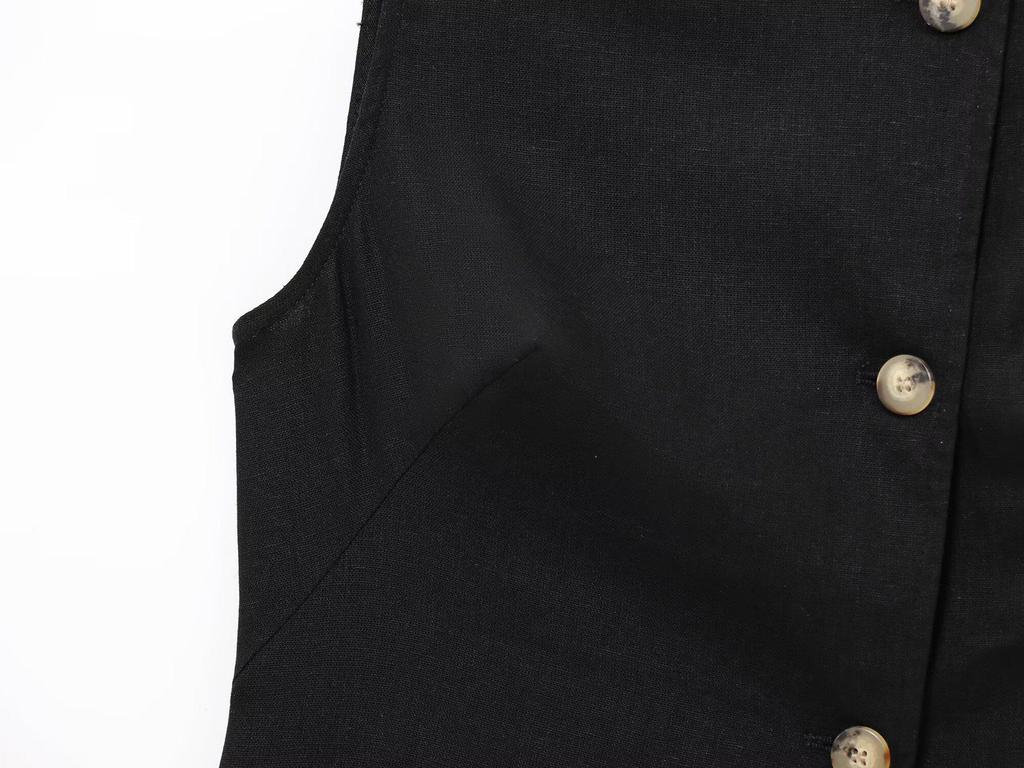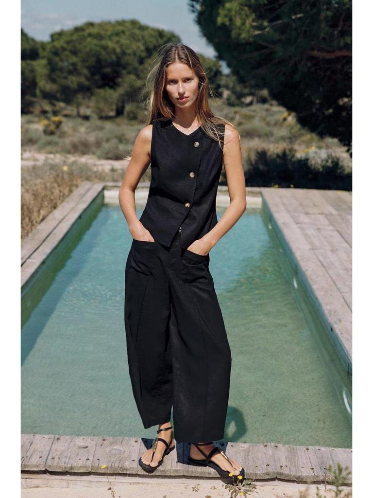 Пополните свой летний гардероб этим элегантным женским модным комплектом, включающим шикарный двубортный жилет и подходящие брюки широкого кроя.. Этот ансамбль, изготовленный из высококачественной льняной смеси, предлагает изысканный минималистичный дизайн с однотонным узором, идеально подходящий для мероприятий в теплую погоду.. Дышащая ткань обеспечивает комфорт, сохраняя при этом изысканный внешний вид, что делает ее универсальным выбором как для повседневных прогулок, так и для официальных мероприятий.. Комплект воплощает неподвластный времени стиль и непринужденную элегантность, идеально подходящий для современной женщины.