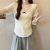 Женская летняя футболка в корейском стиле, облегающая, с бантом, кружевной вставкой и коротким рукавом