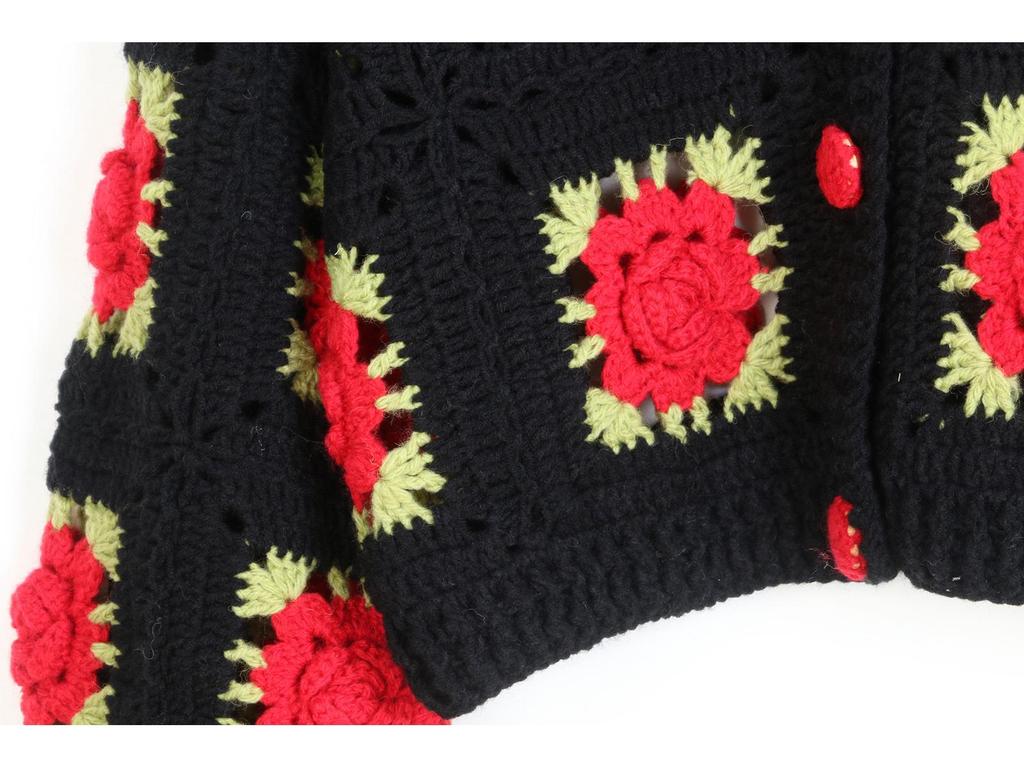 Кардиган с V-образным вырезом, 3D розами ручной вязки - Однотонный, Длинный рукав, Ажурный дизайн, Идеально подходит для весны и осени.