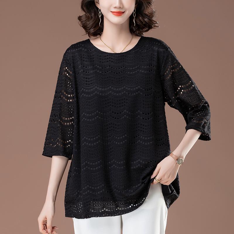 Кружевной топ с рукавом семь восьмых: Летний Большой Размер Свободного Кроя для Женщин Среднего Возраста, Модные Ажурные Рукава Средней Длины