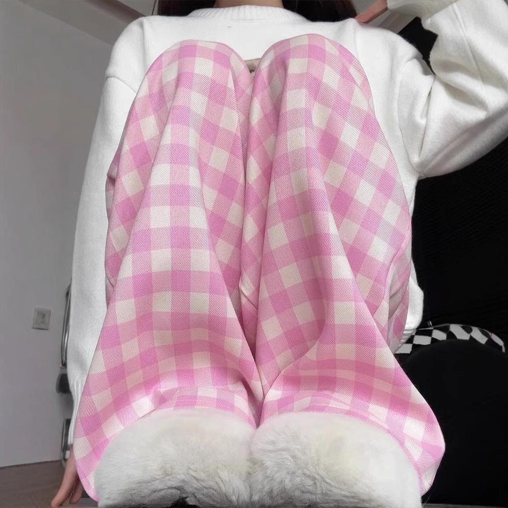 Женские розовые клетчатые свободные брюки прямого кроя с высокой посадкой и широкими штанинами - Весна/Осень 2025