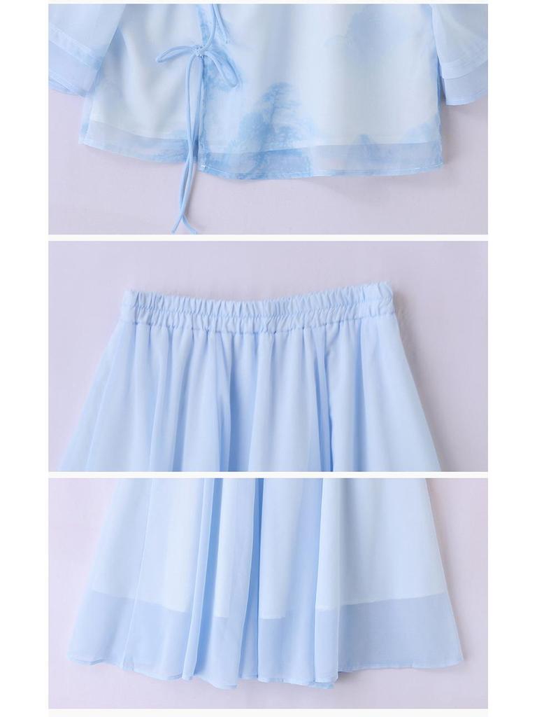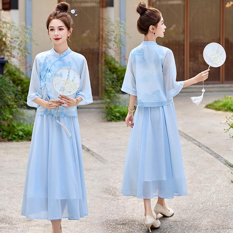 Окунитесь в элегантность с этим изысканным комплектом-двойкой, включающим топ с расклешенными рукавами в китайском стиле и подходящую юбку.. Этот комплект, украшенный ярким цветочным узором, изготовлен из высококачественного полиэстера для удобной посадки.. Идеальный для создания стильного образа в летние месяцы, ансамбль сочетает в себе традиционные элементы дизайна с современным шиком.