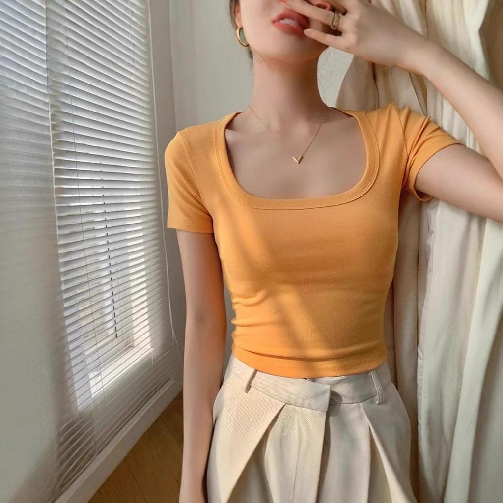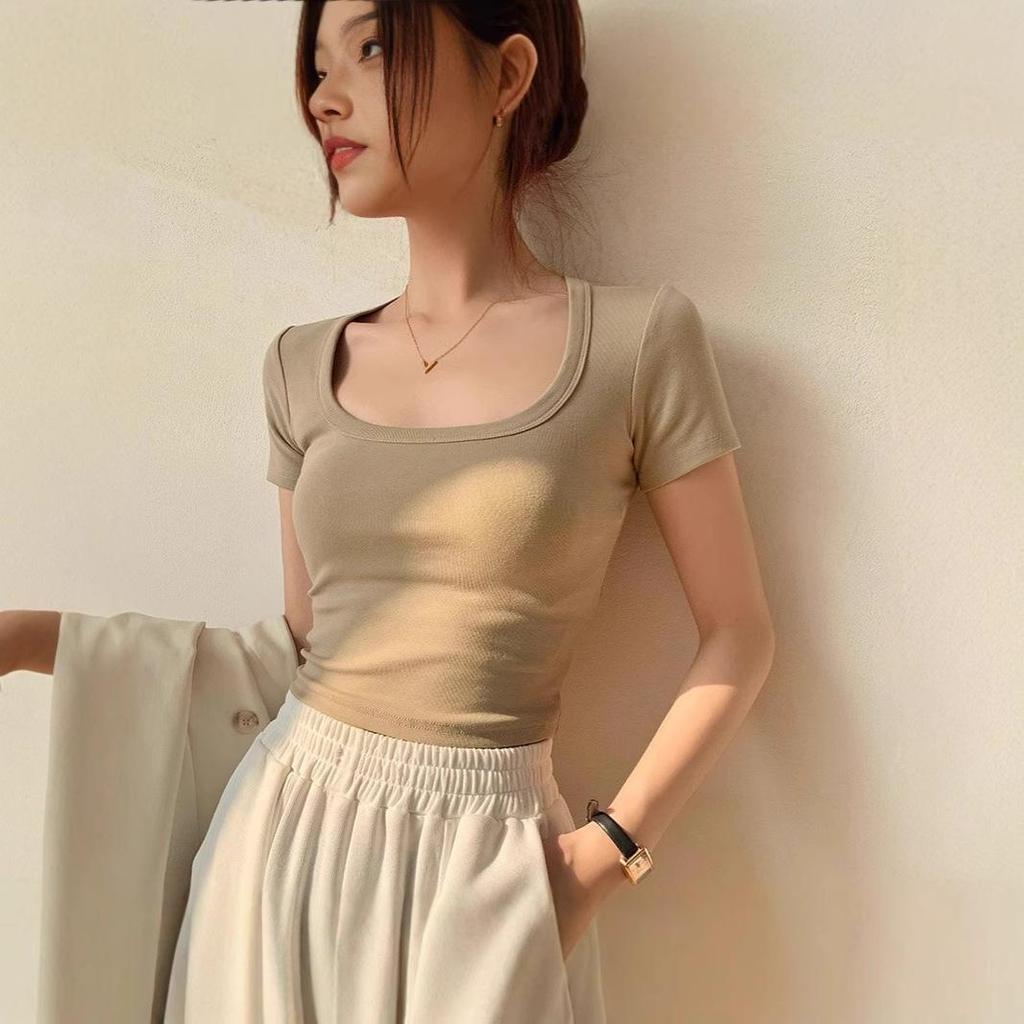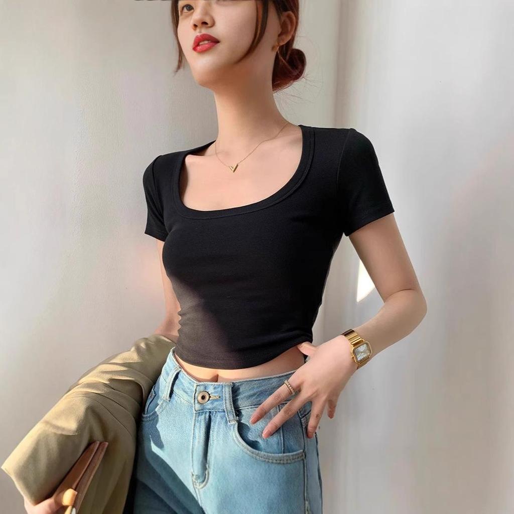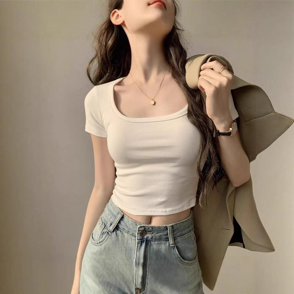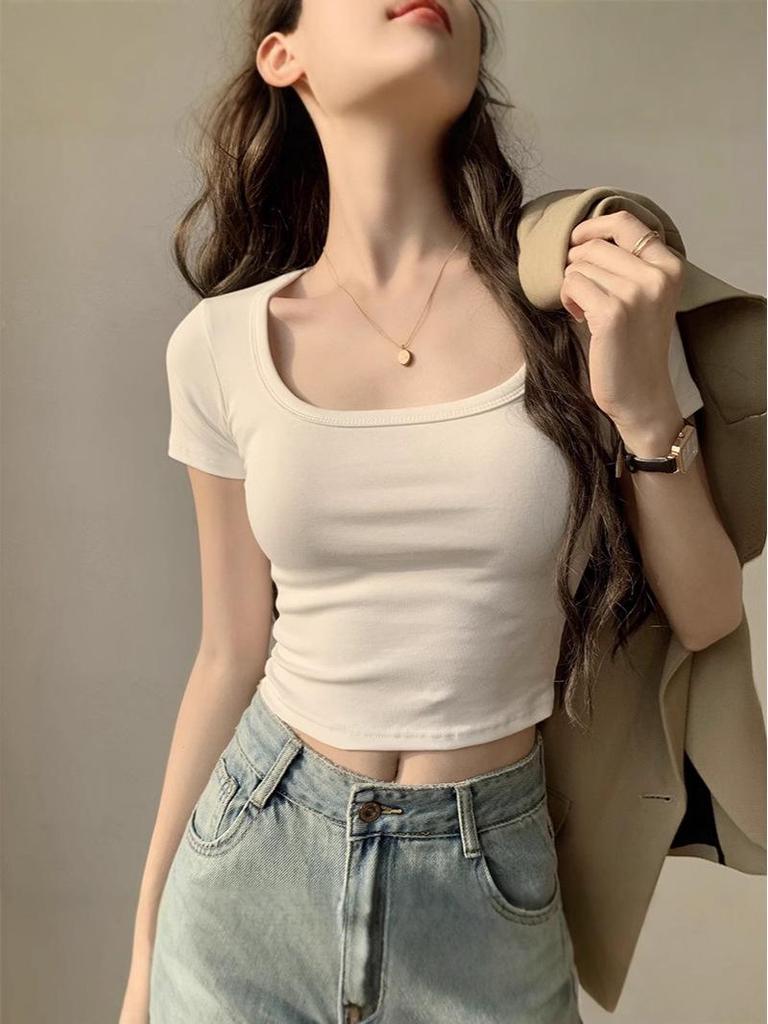 Женский летний белый кроп-топ с U-образным вырезом - Сладкий и пикантный короткий рукав
