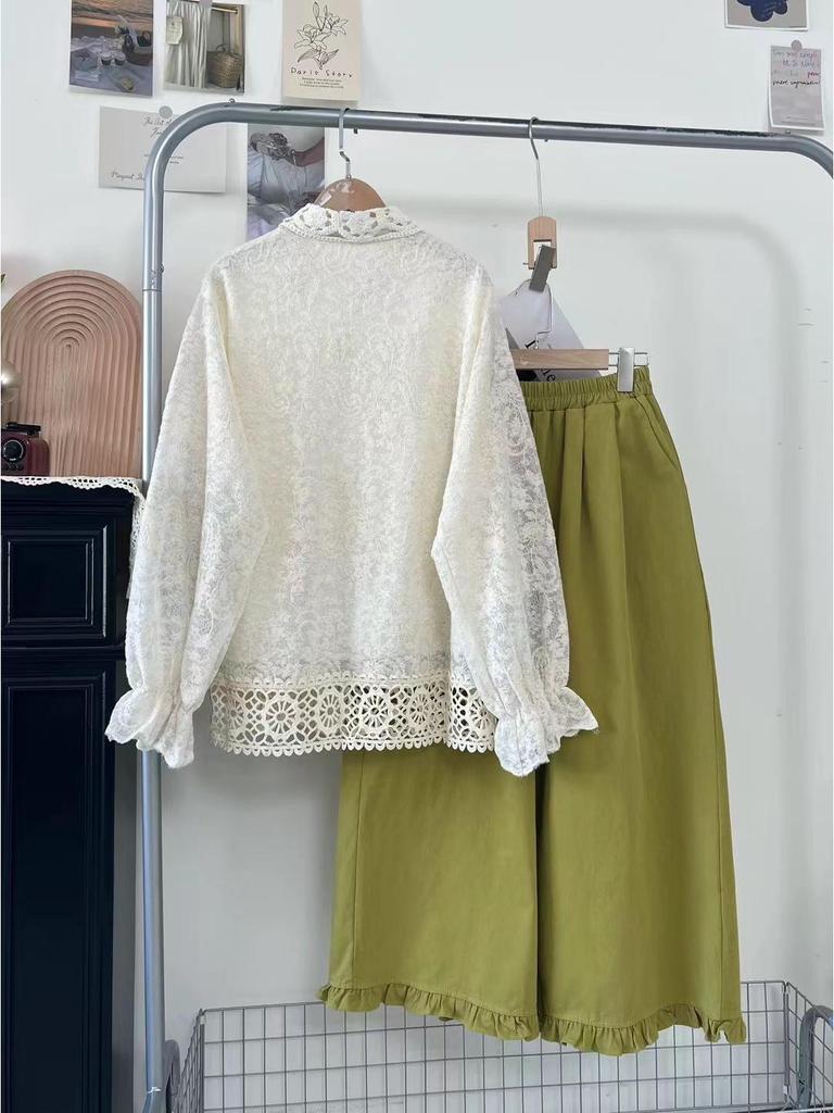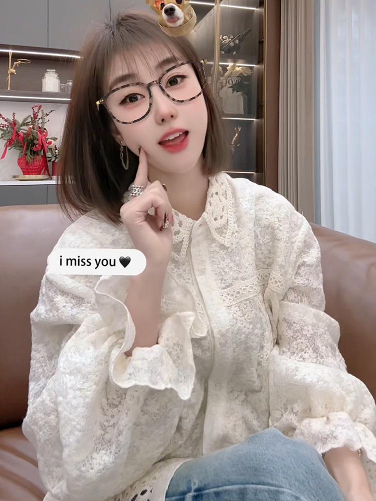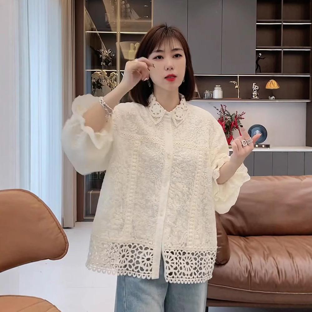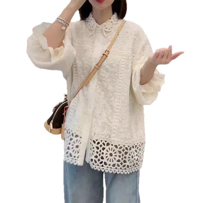 Блузка с кружевным отложным воротником в корейском стиле - 2025 Весна Женская Свободного кроя, с длинным рукавом