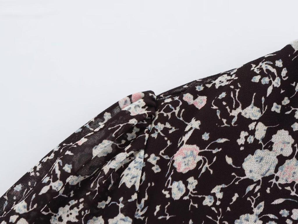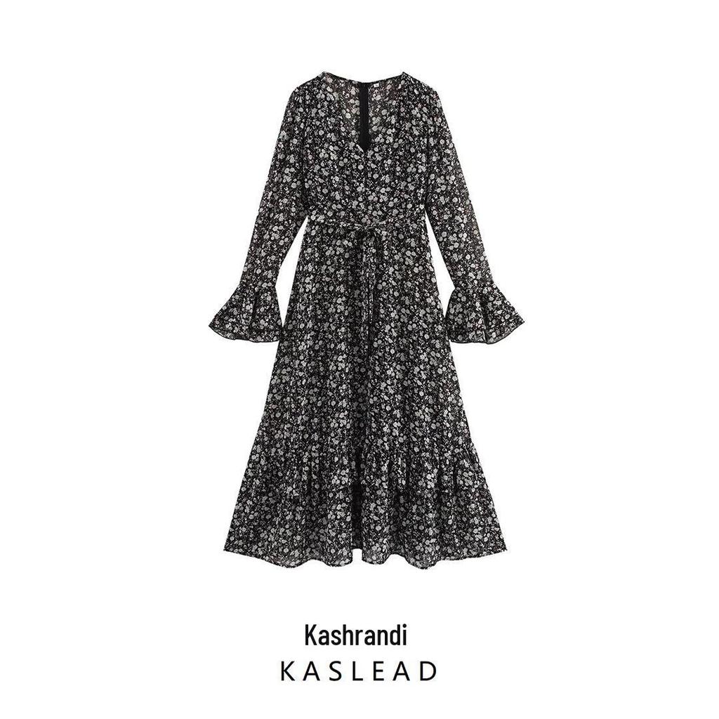 Весна 2025 Женское европейское и американское платье в стиле шифон с V-образным вырезом, цветочным принтом, облегающее талию, длинное