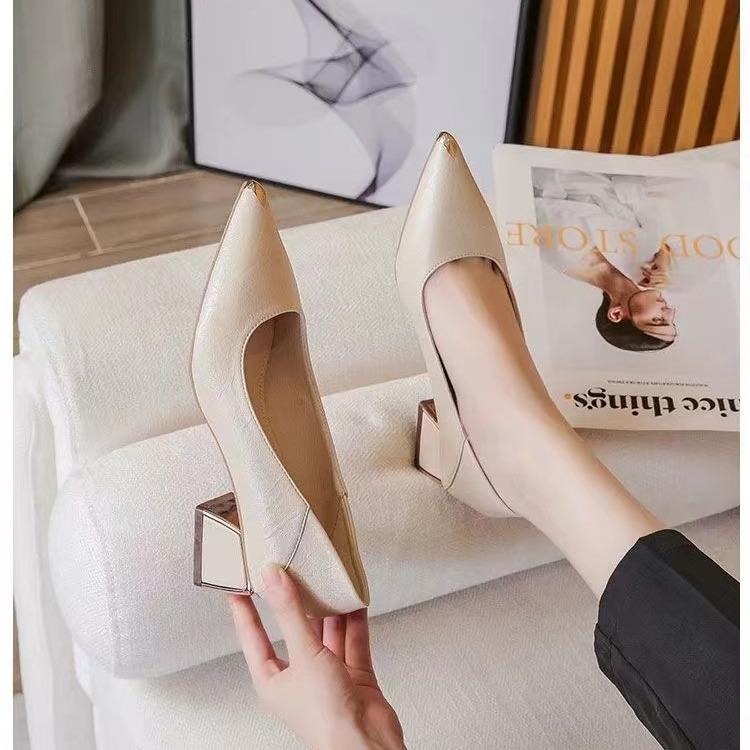 Остроносые туфли на высоком каблуке женственность толстый каблук 2024 новые средний каблук весна и осень черные профессиональные универсальные удобные мягкая подошва одинарные туфли