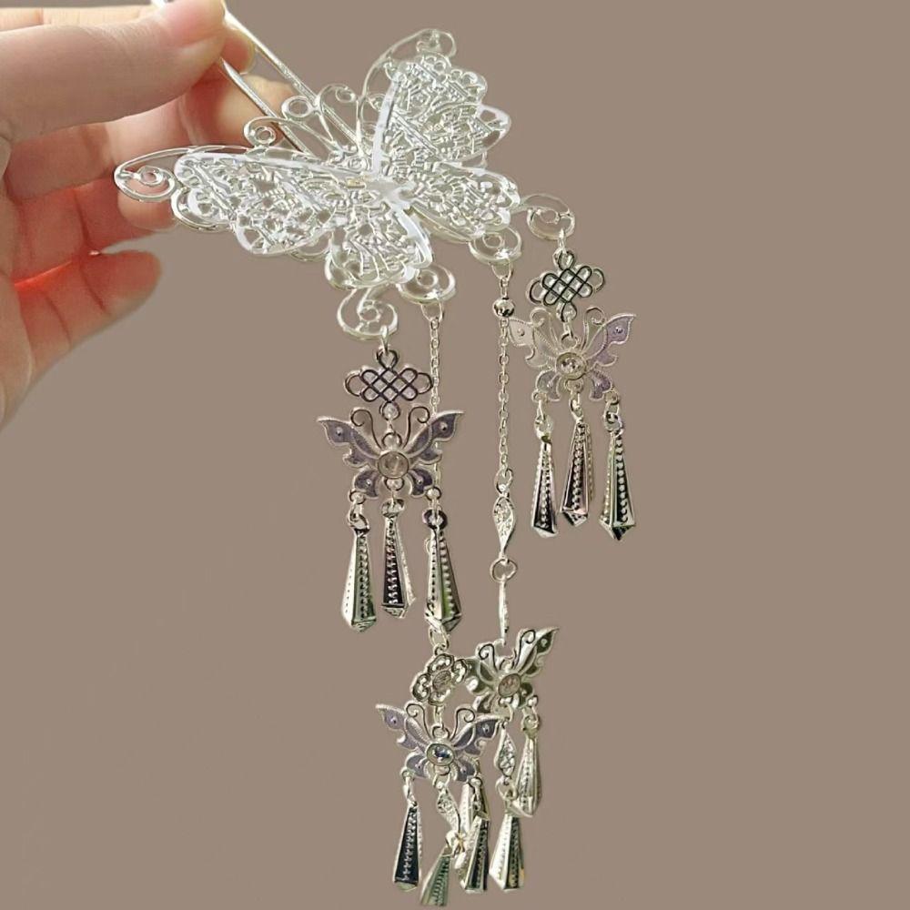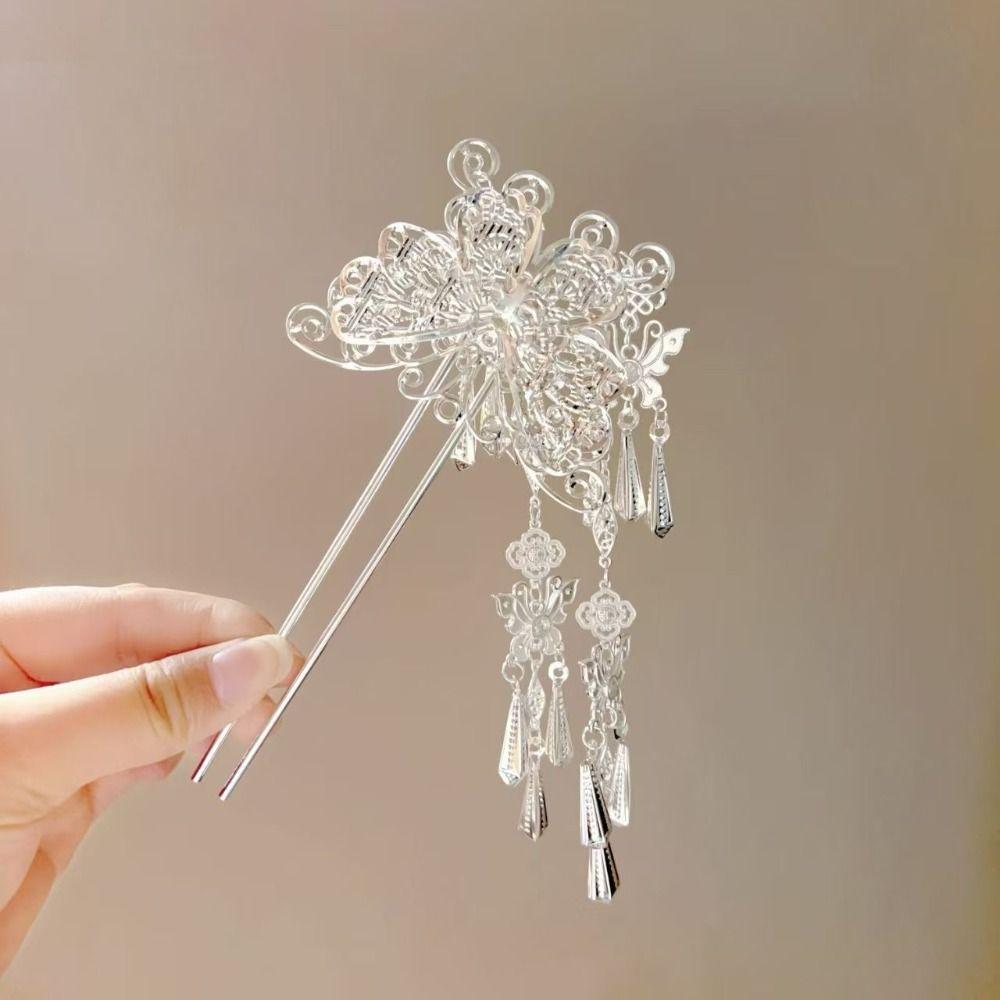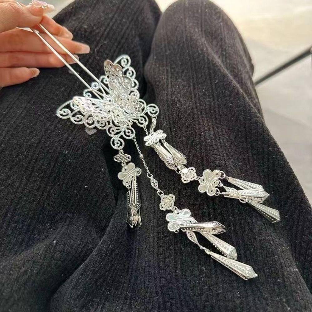 Металлическая заколка для волос с кисточкой в виде бабочки, серебристая, шпильки для волос ханьфу, антикварный этнический стиль, головной убор, для девочек