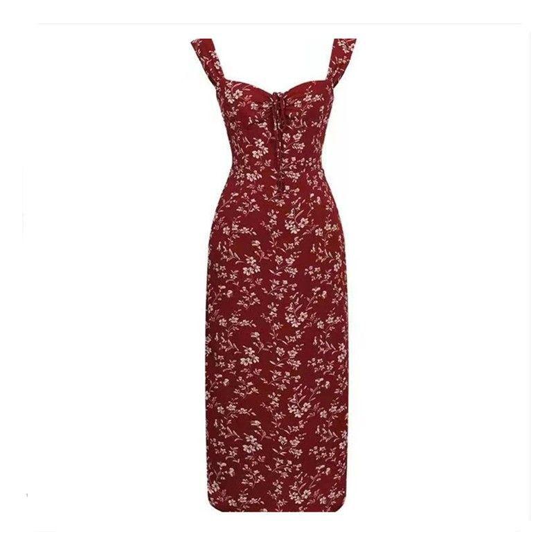 Женское красное платье с цветочным принтом на тонких бретельках для ранней весны 2025 года - Французский миниатюрный стиль для свиданий