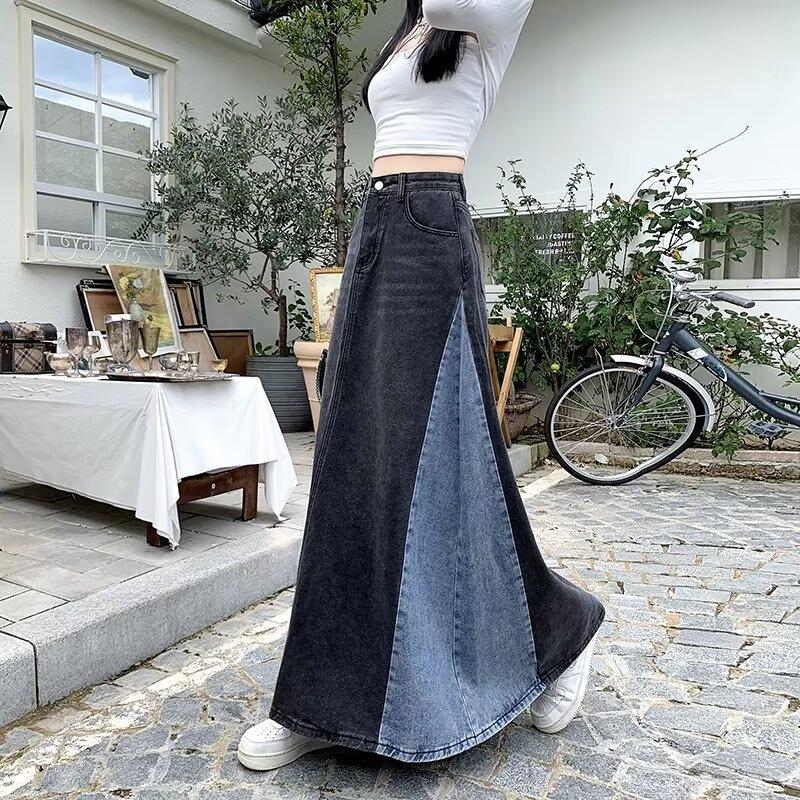 Ретро Джинсовая Юбка Миди А-силуэта в Лоскутном Стиле - Весна 2025 Женская Приталенная Модель с Цветным Блочным Дизайном — купить товар онлайн с бесплатной доставкой до всему миру!
