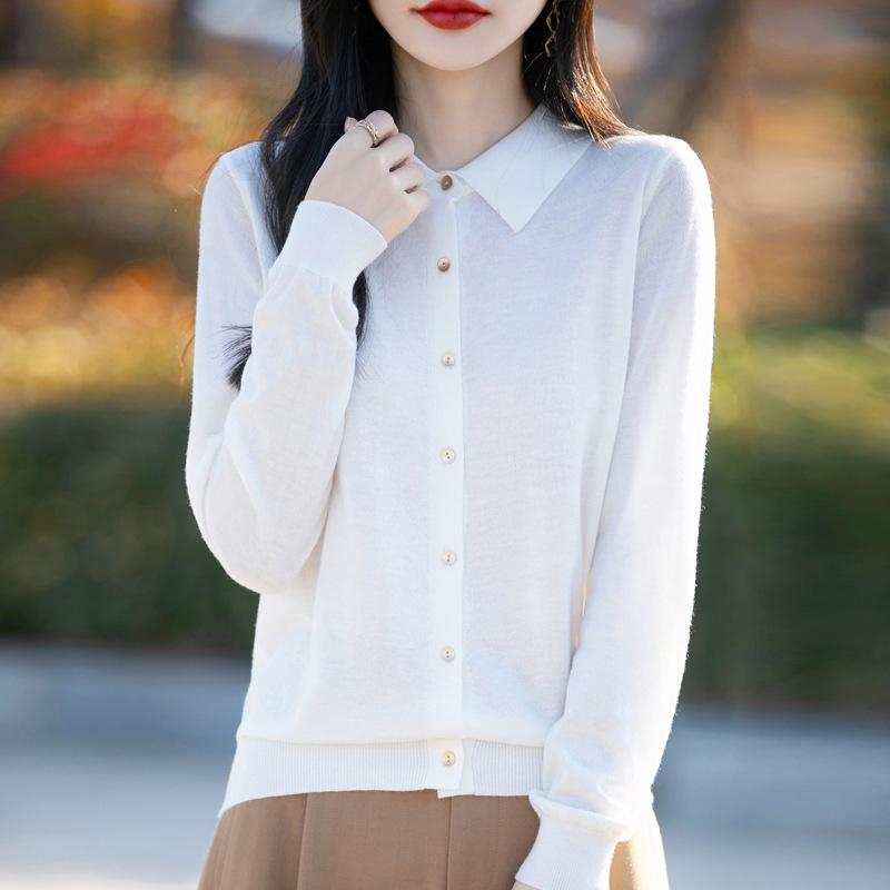 Женский трикотажный кардиган из мериносовой шерсти с воротником поло - Тонкое пальто-свитер, омолаживающее — купить товар онлайн с бесплатной доставкой по всему миру!