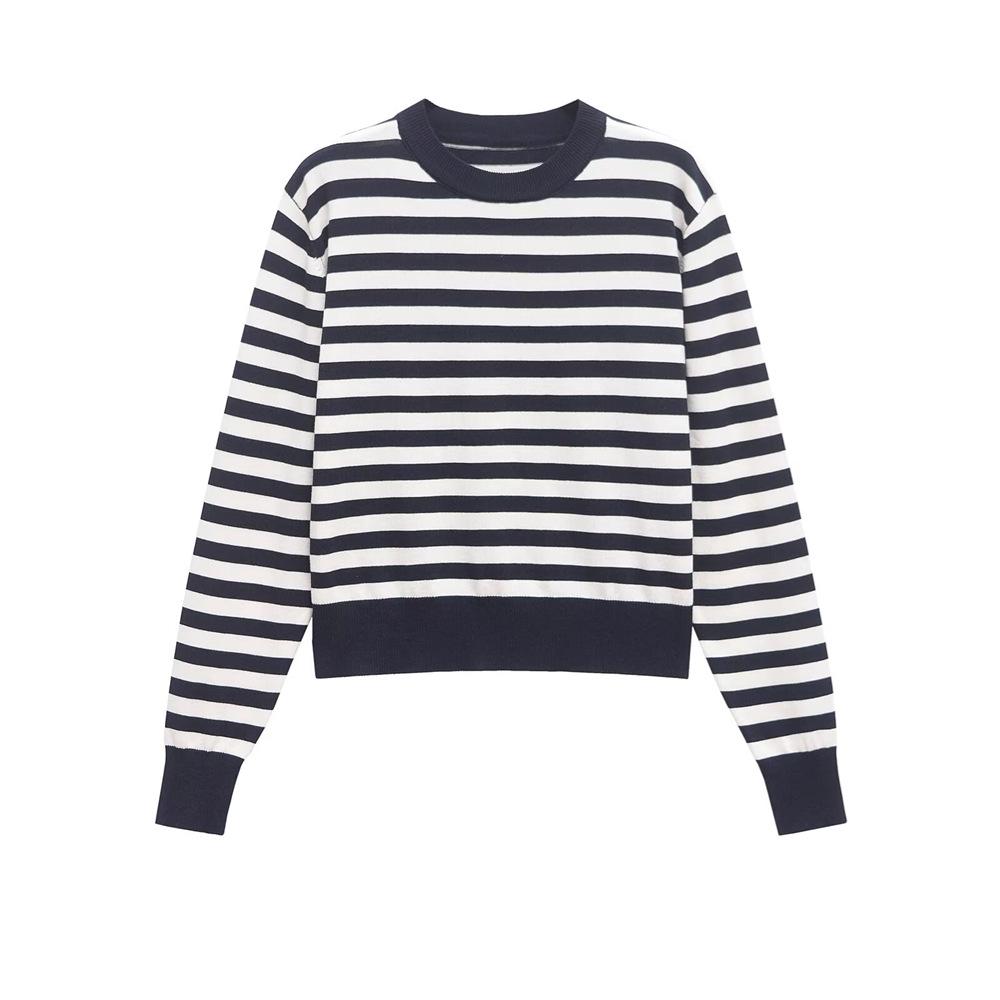 Представляем наш стильный женский вязаный пуловер в полоску и с цветными блоками из высококачественного полиэстера для удобной и дышащей посадки.. Этот пуловер имеет классический круглый вырез и длинные рукава, что делает его идеальным для прохладных весенних дней.. Привлекательный дизайн дополнен элегантным пэчворком и стегаными украшениями, создающими уникальный и современный вид.. Идеальный для повседневных прогулок или шикарного повседневного ансамбля, этот универсальный пуловер — незаменимое дополнение к вашему весеннему гардеробу.