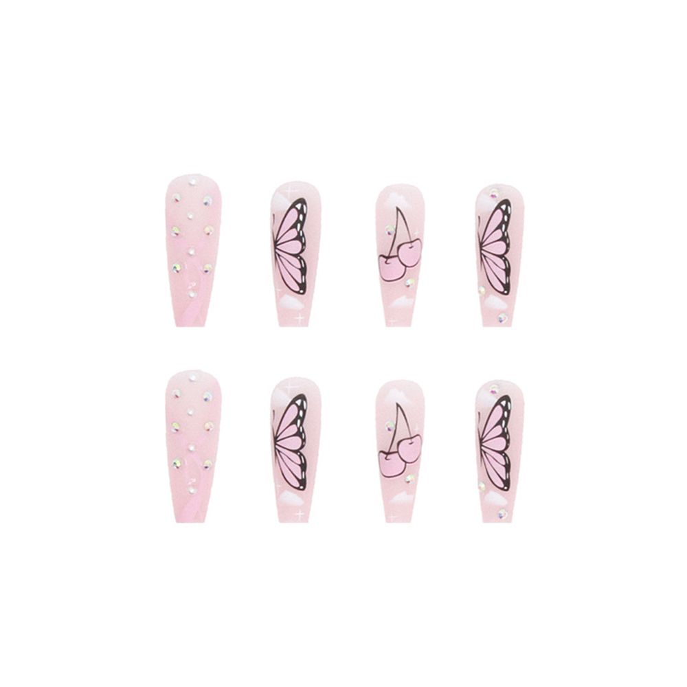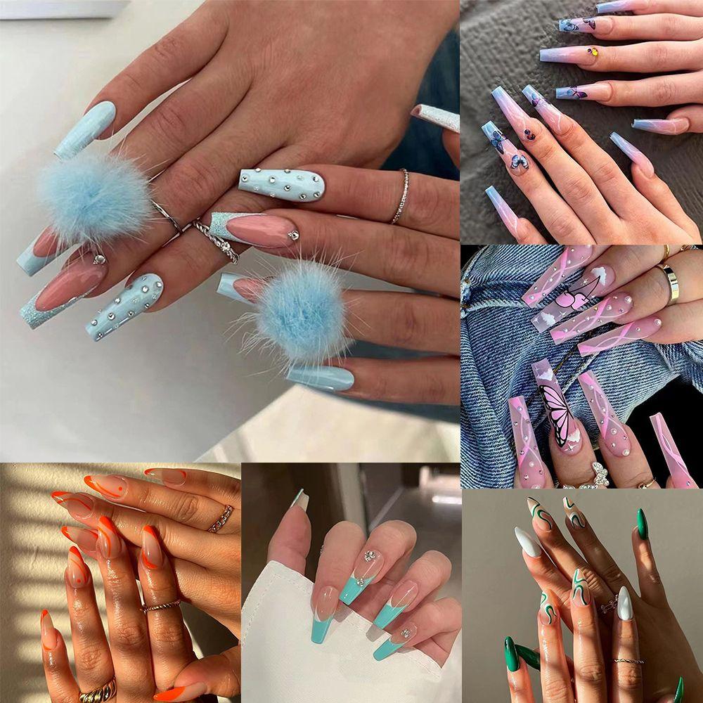 24pcs Detachable Butterfly Bear Blue Fur Ball False Nail Fake Nails Blue Waves Full Cover