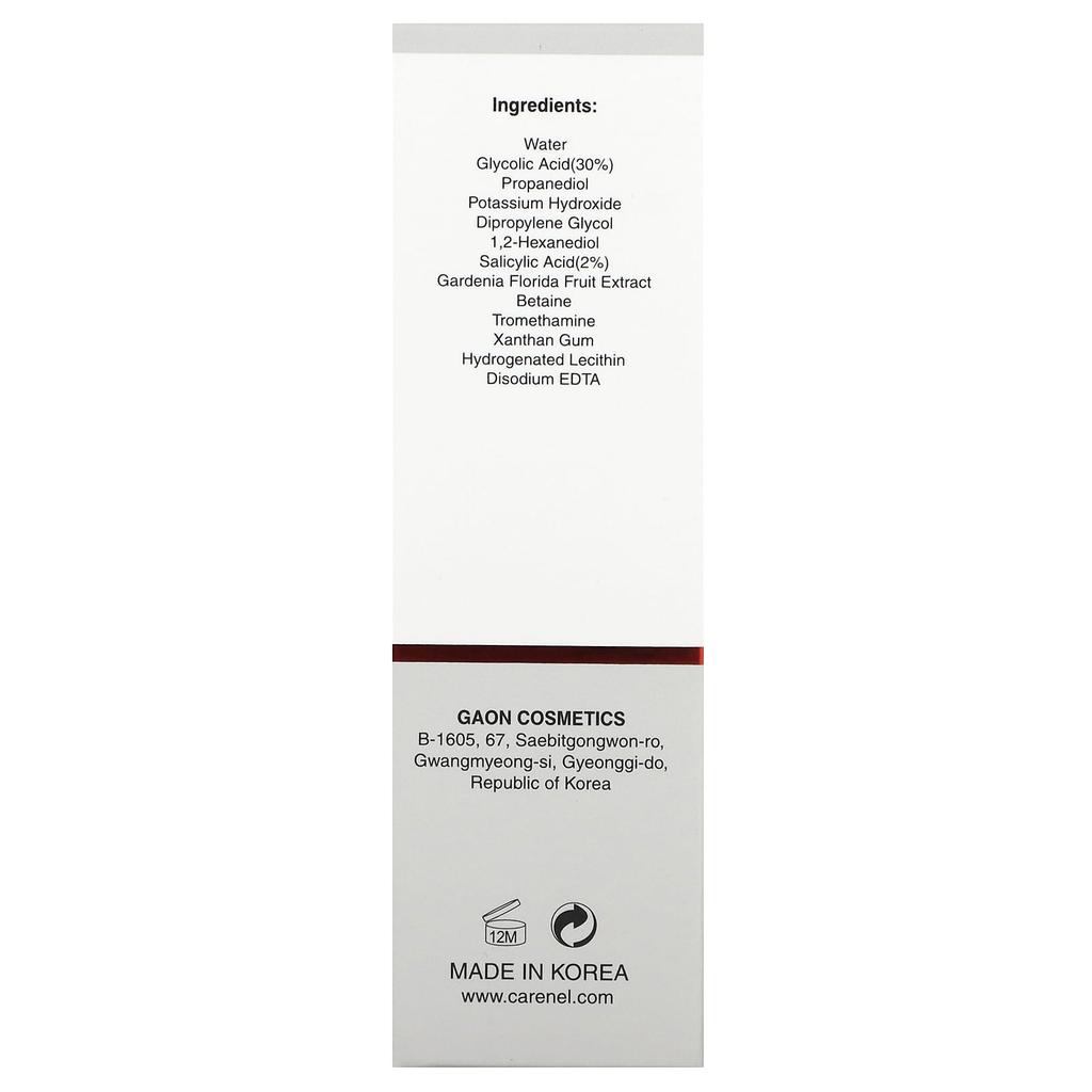 Ингредиенты: вода, гликолевая кислота (30%), пропандиол, гидроксид калия, дипропиленгликоль, 1,2-гександиол, салициловая кислота (2%), экстракт плодов гардении флоридской, бетаин, трометамин, ксантановая камедь, гидрогенизированный лецитин, динатриевая соль ЭДТА.