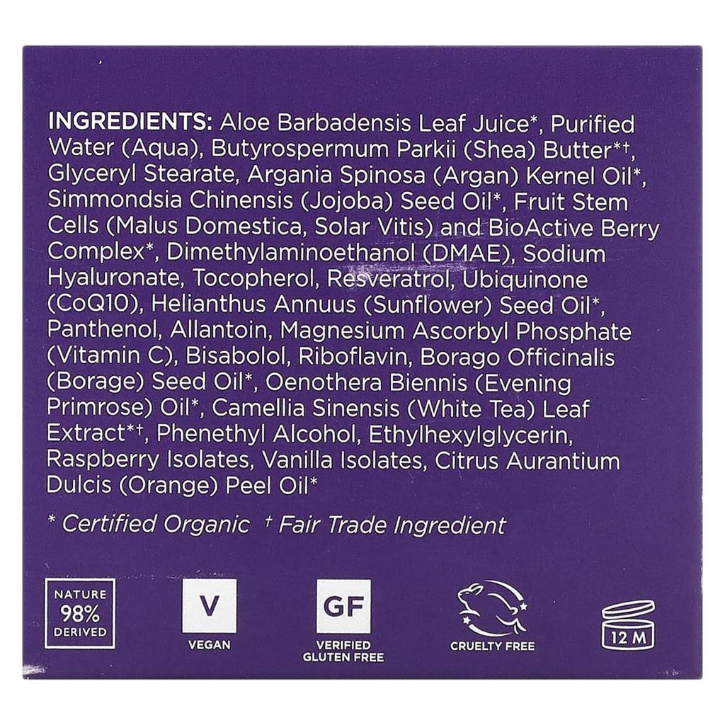 aloe barbadensis leaf juice*, purified water (aqua), butyrospermum parkii (shea) butter*†, glyceryl stearate, argania spinosa (argan) kernel oil, simmondsia chinensis (jojoba) seed oil*, fruit stem cells (malus domestica, solar vitis), bioactive berry complex*, dimethylaminoethanol (dmae), sodium hyaluronate, tocopherol, resveratrol, ubiquinone (coq10), sunflower seed oil*, panthenol, allantoin, magnesium ascorbyl phosphate (vitamin c), bisabolol, riboflavin, hibiscus large flower extract*, phenethyl alcohol, ethylhexylglycerin, raspberry isolate, vanilla bean isolate, citrus arantium dulis (citrus orange) peel oil*. *certified organic†fair trade ingredients