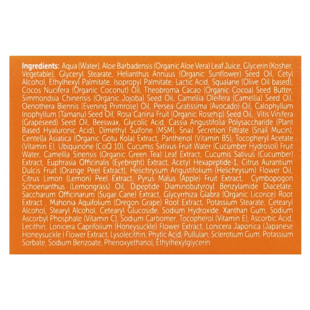 purified water, organic aloe barbadensis leaf juice, glycerin (kosher, vegetable), glyceryl stearate, organic sunflower (helianthus annuus) seed oil, cetyl alcohol, ethylhexyl palmitate, isopropyl palmitate, lactic acid, squalane (olive oil raw material), organic coconut (cocos nucifera) oil, organic cocoa (theobroma cacao) seed butter, organic jojoba (simmondsia chinensis) seed oil, camellia (camellia oleifera) seed oil, evening primrose (oenothera biennis) oil, avocado (persea gratissima) oil, tamanu (calophyllum inophyllum) seed oil, organic rosehip (rosa canina) seed oil, grape (vitis vinifera) seed oil, beeswax, glycolic acid, senna (cassia angustifolia) polysaccharide (vegetable hyaluronic acid), dimethyl sulfone (msm), snail secretion filtrate (snail mucin), organic centella asiatica (centella) extract, panthenol (vitamin b5), tocopheryl acetate (vitamin e), ubiquinone (coq10), cucumber (cucumis sativus) fruit water, organic green tea (camellia sinensis) leaf extract, cucumber (cucumis sativus) extract, eyebright (euphrasia officinalis) extract, acetyl hexapeptide-1, orange (citrus aurantium dulcis) peel extract, curry plant (helichrysum angustifolium) flower oil, lemon (citrus limon) peel extract, apple (pyrus malus) fruit extract, lemongrass (cymbopogon schoenanthus) oil, dipeptide diaminobutyloyl benzylamide diacetate, sugarcane (saccharum officinarum) extract, organic licorice (glycyrrhiza glabra) root extract, oregon grape (mahonia aquifolium) root extract, potassium stearate, cetearyl alcohol, stearyl alcohol, cetearyl glucoside, sodium hydroxide, xanthan gum, sodium ascorbyl phosphate (vitamin c), sodium carbomer, tocopherol (vitamin e), ascorbic acid, lecithin, honeysuckle (lonicera caprifolium) flower extract, japanese honeysuckle (lonicera japonica) flower extract, lysolecithin, phytic acid, pullulan, sclerotium gum, potassium sorbate, sodium benzoate, phenoxyethanol, ethylhexylglycerin