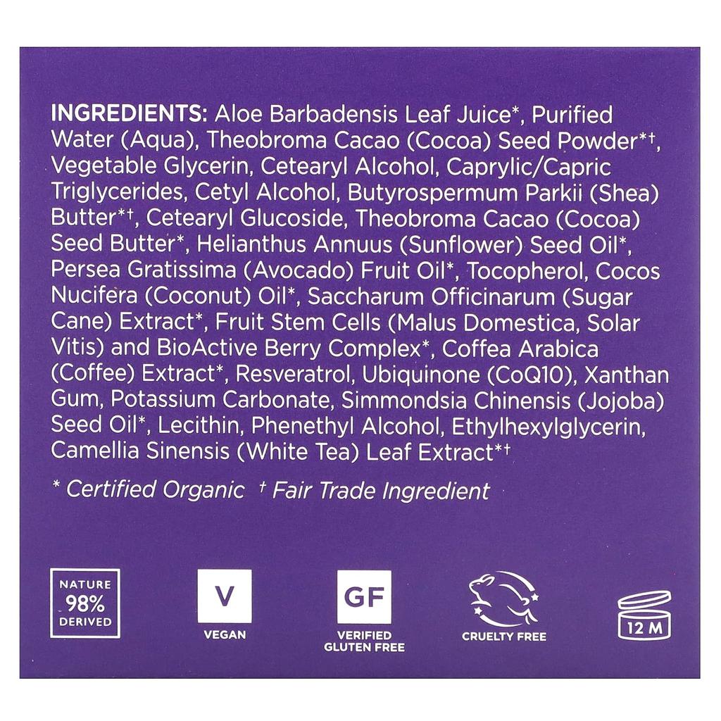 aloe barbadensis leaf juice*, purified water, cacao (theobroma cacao) seed powder*†, vegetable glycerin, cetearyl alcohol, caprylic/capric triglyceride, cetyl alcohol, shea (butyrospermum parkii) butter*†, cetearyl glucoside, cacao (theobroma cacao) seed butter*, sunflower (helianthus annuus) seed oil*, avocado (persea gratissima) fruit oil*, tocopherol, coconut (cocos nucifera) oil*, sugarcane (saccharum officinarum) extract*, fruit stem cells (apple (malus domestica), grape (solar vitis)) and bioactive berry complex*, coffee bean (coffea arabica) extract*, resveratrol, ubiquinone (coq10), xanthan gum, potassium carbonate, jojoba (simmondsia chinensis) seed oil*, lecithin, phenethyl alcohol, ethylhexylglycerin, white tea (camellia sinensis) leaf extract*†. *certified organic†fair trade ingredients