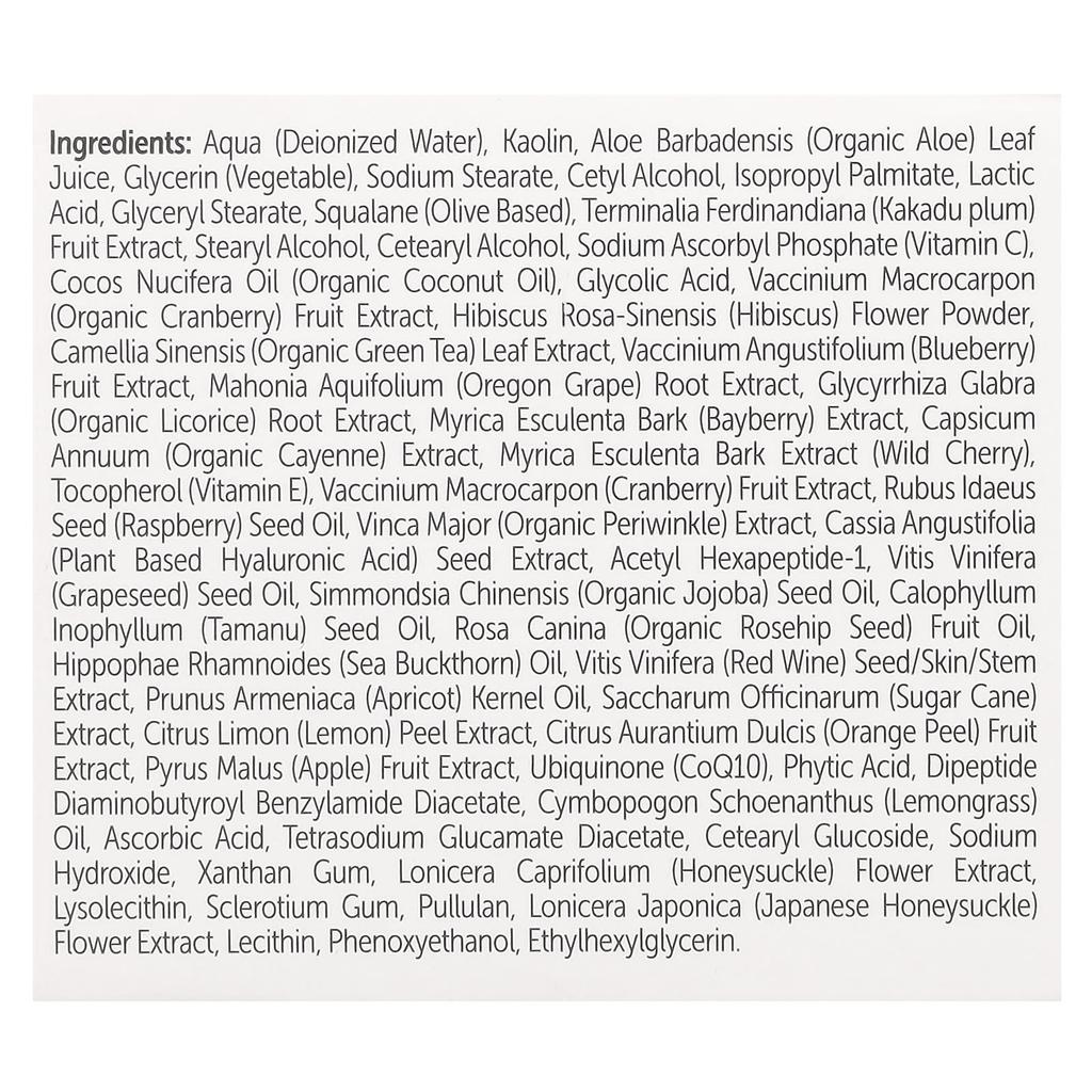 deionized water, kaolin, organic aloe (aloe barbadensis) leaf juice, glycerin (vegetable), sodium stearate, cetyl alcohol, isopropyl palmitate, lactic acid, glyceryl stearate, squalane (olive raw material), kakadu plum (terminalia ferdinandiana) fruit extract, stearyl alcohol, cetearyl alcohol, sodium ascorbyl phosphate (vitamin c), organic coconut (cocos nucifera) oil, glycolic acid, organic cranberry (vaccinium macrocarpon) fruit extract, hibiscus (hibiscus rosa-sinensis) flower powder, organic green tea (camellia sinensis) leaf extract, blueberry (vaccinium angustifolium) fruit extract, oregon grape (mahonia aquifolium) root extract, organic licorice (glycyrrhiza glabra) root extract, cowberry (myrica esculenta) bark extract, organic cayenne (capsicum annuum) extract, wild cherry (myrica esculenta) bark extract, tocopherol (vitamin e), cranberry (vaccinium macrocarpon) fruit extract, raspberry (rubus idaeus) seed oil, organic bamboo (vinca major) extract, senna (cassia angustifolia) seed extract, acetyl hexapeptide-1, grape (vitis vinifera) seed oil, organic jojoba (simmondsia chinensis) seed oil, tamanu (calophyllum inophyllum) seed oil, organic rosehip seed (rosa canina) fruit oil, sea buckthorn (hippophae rhamnoides) oil, red wine (vitis vinifera) seed/peel/stem extract, apricot (prunus armeniaca) kernel oil, sugarcane (saccharum officinarum) extract, lemon (citrus limon) peel extract, orange peel (citrus aurantium dulcis) fruit extract, apple (pyrus malus) fruit extract, ubiquinone (coq10), phytic acid, dipeptide diaminobutyloyl benzylamide diacetate, lemongrass (cymbopogon schoenanthus) oil, ascorbic acid, tetrasodium glutamate diacetate, cetearyl glucoside, sodium hydroxide, xanthan gum, honeysuckle (lonicera caprifolium) flower extract, rhizolecithin, sclerotium gum, pullulan, japanese honeysuckle (lonicera japonica) flower extract, lecithin, phenoxyethanol, ethylhexylglycerin.