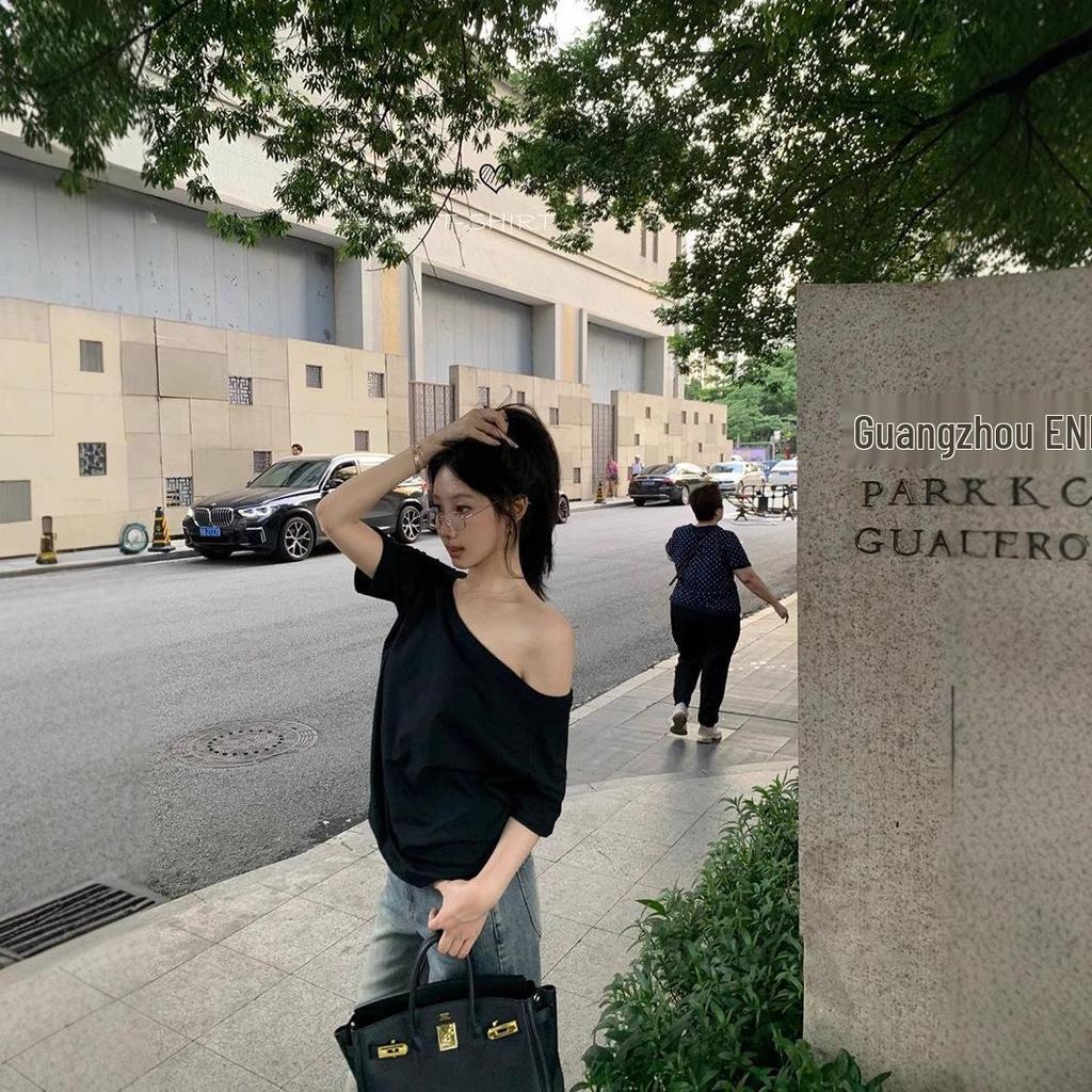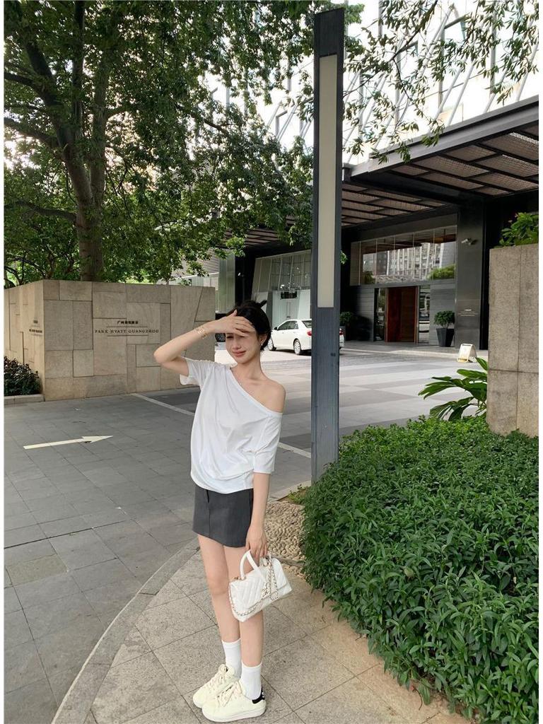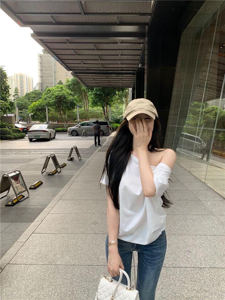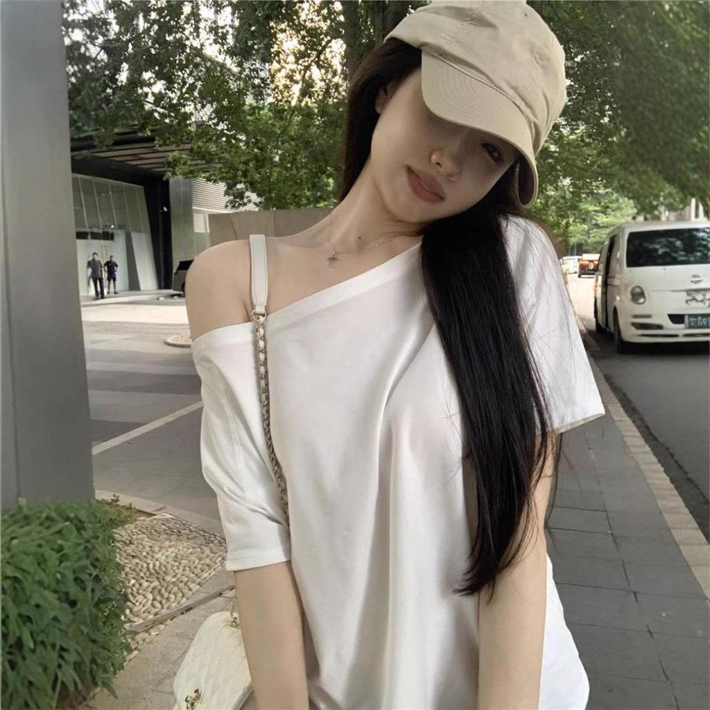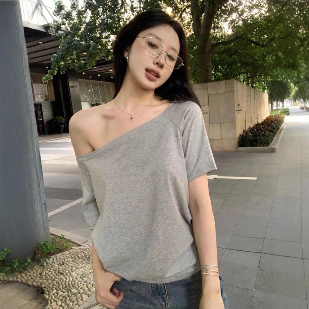 Женская серая футболка с коротким рукавом и открытыми плечами - Повседневный, свободный и простой летний топ