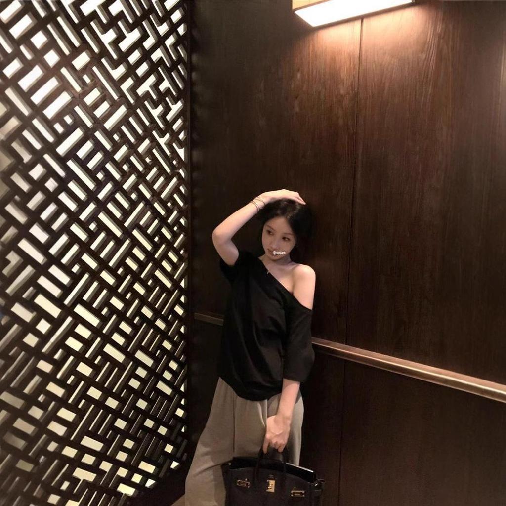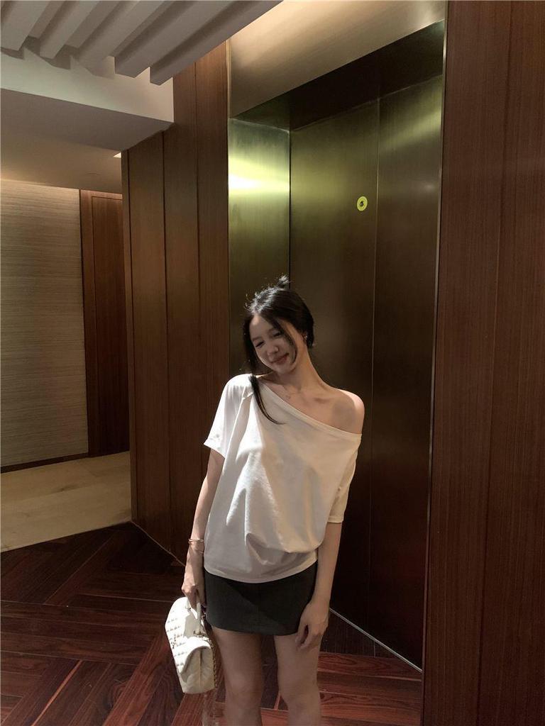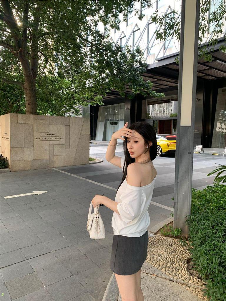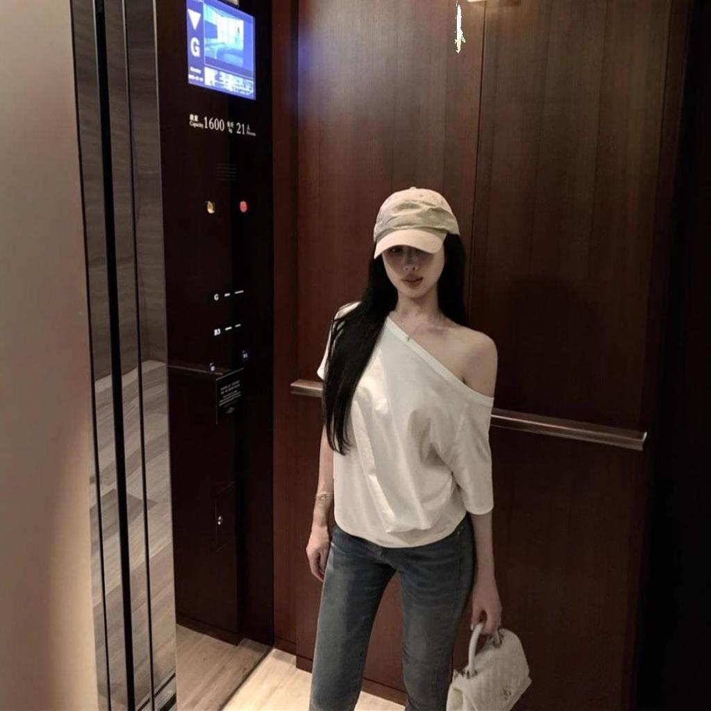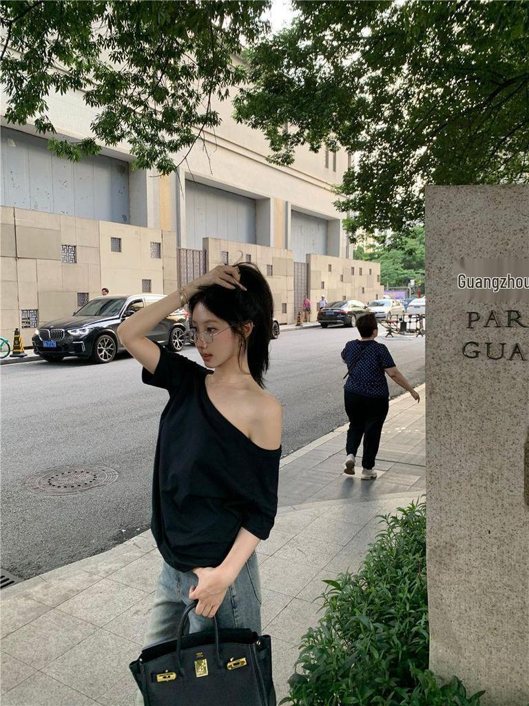 Женская серая футболка с коротким рукавом и открытыми плечами - Повседневный, свободный и простой летний топ