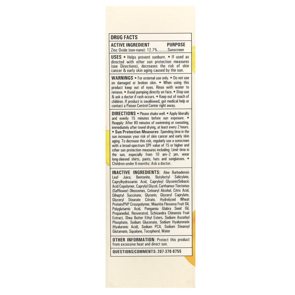 Как использовать: Хорошо встряхнуть перед использованием. Равномерно нанесите за 15 минут до выхода на солнце.. Повторно подать заявку: Сразу после 80 минут плавания или потения и не реже одного раза каждые 2 часа. Как защитить себя от солнца: Длительное пребывание на солнце увеличивает риск рака кожи и преждевременного старения кожи. Чтобы снизить этот риск, регулярно наносите солнцезащитный крем широкого спектра с SPF 15 или выше.. Другие способы защиты от солнца включают в себя:: Ограничение активности на открытом воздухе в течение дня, особенно между 10 часами утра. и 14:00. Носите рубашки с длинными рукавами и длинные брюки, а также надевайте шляпу и солнцезащитные очки.. Проконсультируйтесь с врачом перед использованием у младенцев младше 6 месяцев.. ингредиенты : Информация об ингредиентах Активный ингредиент Оксид цинка (не-нано ингредиент): 12,7% защита от УФ-излучения Другие ингредиенты Сок листьев алоэ вера, бентонит, бутилоктил салицилат, каприлгидроксамовая кислота, каприлоилглицерин/себациновой кислоты сополимер, каприлилгликоль, олеосомы Carthamus tinctorius, цетеариловый спирт, лимонная кислота, дигептилсукцинат, глицерилкаприлат, глицерилкаприлат, милтерилат протеин/ПВП кроссполимер, масло плодов Mauritia flexuosa, полиглутаминовая кислота, масло семян Pongamia glabra, пропандиол, ресвератрол, экстракт плодов Schisandra chinensis, этиловый эфир масла ши, натрия аскорбилфосфат, глюконат натрия, гиалуронат натрия (гиалуроновая кислота), натрия пирролидонкарбоксилат, натрия стеароилглутамат, сквалан, токоферол, очищенная вода.