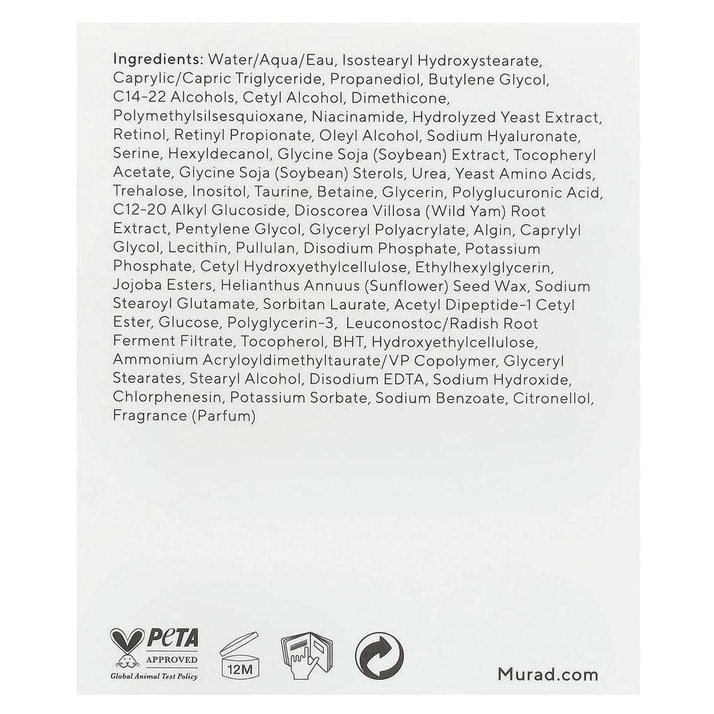 purified water, isostearyl hydroxystearate, caprylic/capric triglyceride, propanediol, butylene glycol, c14-22 alcohol, cetyl alcohol, dimethicone, polymethylsilsesquioxane, niacinamide, hydrolyzed yeast extract, retinol, retinyl propionate, oleyl alcohol, sodium hyaluronate, serine, hexyldecanol, glycine soja (soybean) extract, tocopheryl acetate, gycine soja (soybean) sterol, urea, yeast amino acid, trehalose, inositol, taurine, betaine, glycerin, polyglucuronic acid, c12-20 alkyl glucoside, dioscorea villosa (wild yam) root extract, pentylene glycol, glyceryl polyacrylate, algin, caprylyl glycol, lecithin, pullulan, disodium phosphate, potassium phosphate, cetyl hydroxyethyl cellulose, ethylhexylglycerin, jojoba esters, sunflower (helianthus annuus) seed wax, sodium stearoyl glutamate, sorbitan laurate, acetyl dipeptide-1 cetyl ester, glucose, polyglycerin-3, leuconostoc/radish ferment filtrate, tocopherol, bht, hydroxyethyl cellulose, ammonium acryloyldimethyl taurate/vp copolymer, glyceryl stearate, stearyl alcohol, disodium edta, sodium hydroxide, chlorphenesin, potassium sorbate, sodium benzoate, citronellol, fragrance.