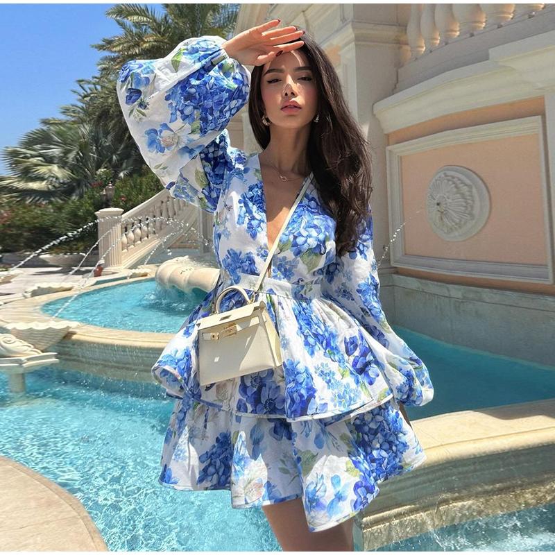 Платье с глубоким V-образным вырезом, оборками по подолу, пышными рукавами-фонариками, элегантное, для отпуска, вечеринки, короткие платья, красочное весеннее платье