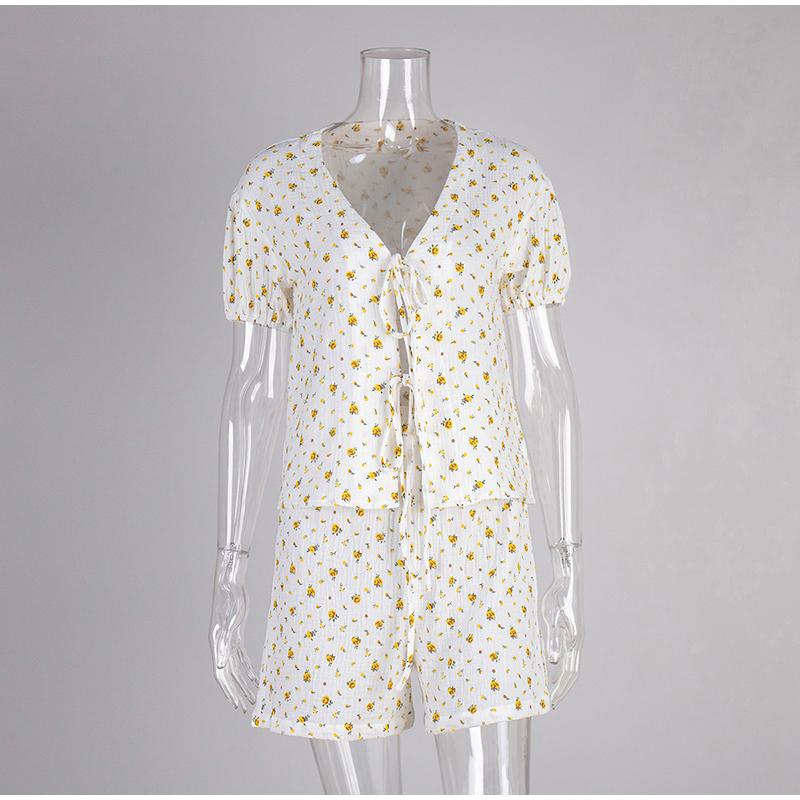 Повседневный принт Шнуровка Женский комплект рубашки Короткий рукав V-образный вырез Топ Широкие брюки с высокой талией Женские шорты Новинка Праздничный костюм — купить товар онлайн с бесплатной доставкой по всему миру!
