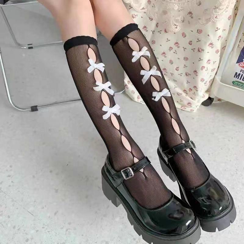 Японские гольфы с бантом в стиле Лолита | Кружевные ажурные гольфы до колена Pure Desire - Летние тонкие и универсальные для JK