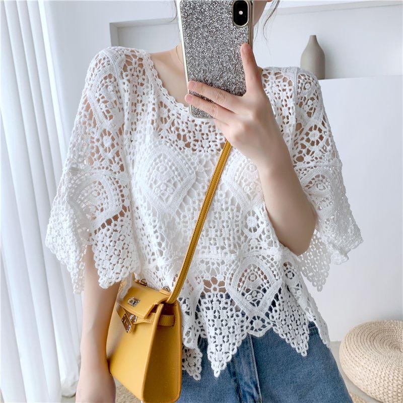 2025 Женская повседневная кружевная блузка: Крошечная шаль с коротким рукавом, ажурная, модный вязаный топ — купить товар онлайн с бесплатной доставкой по всему миру!