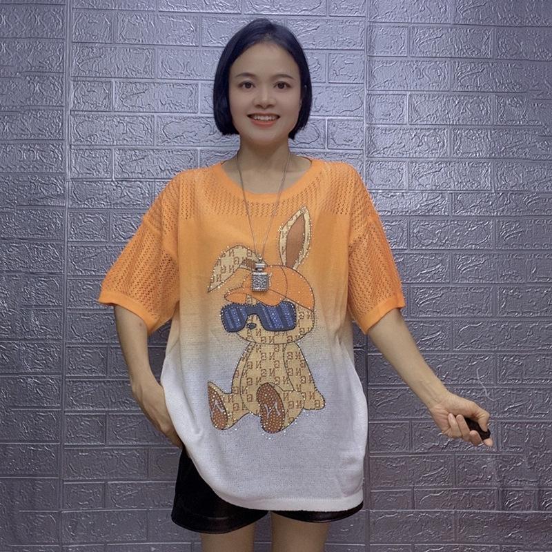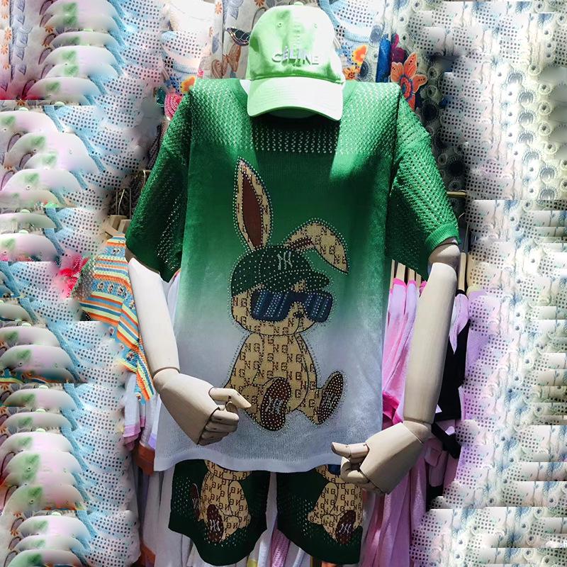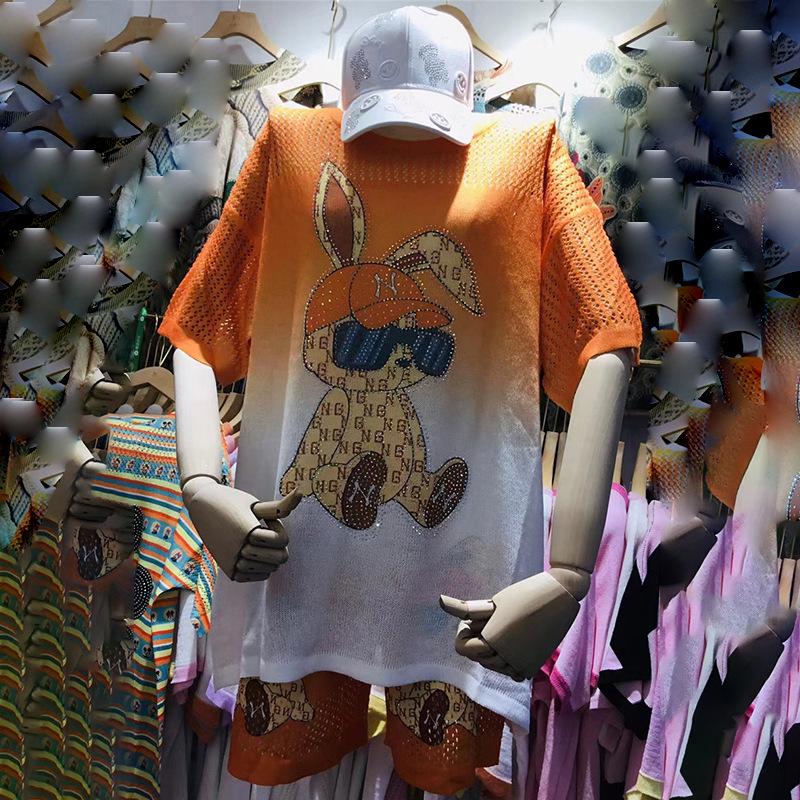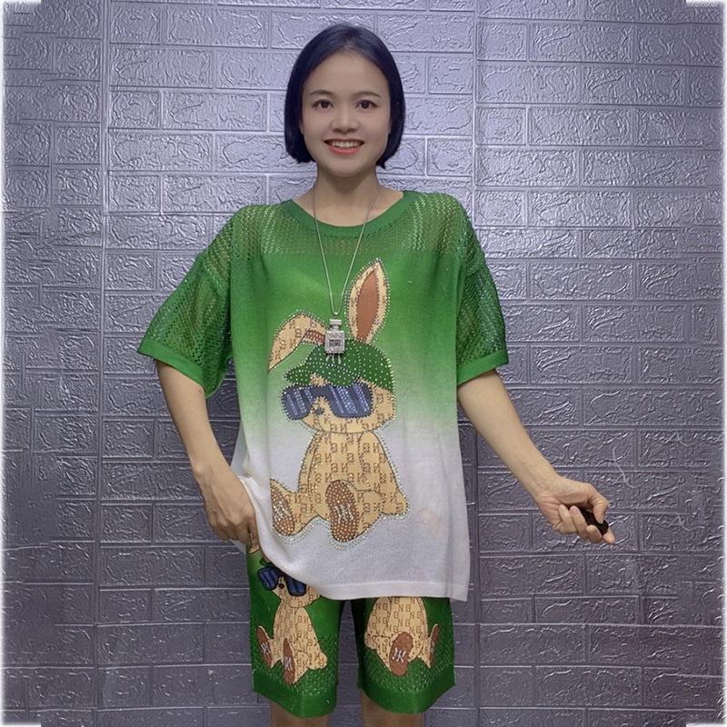Летний женский комплект из двух предметов большого размера из ледяного шелка с принтом кролика, 2025: Повседневный топ с коротким рукавом и шорты